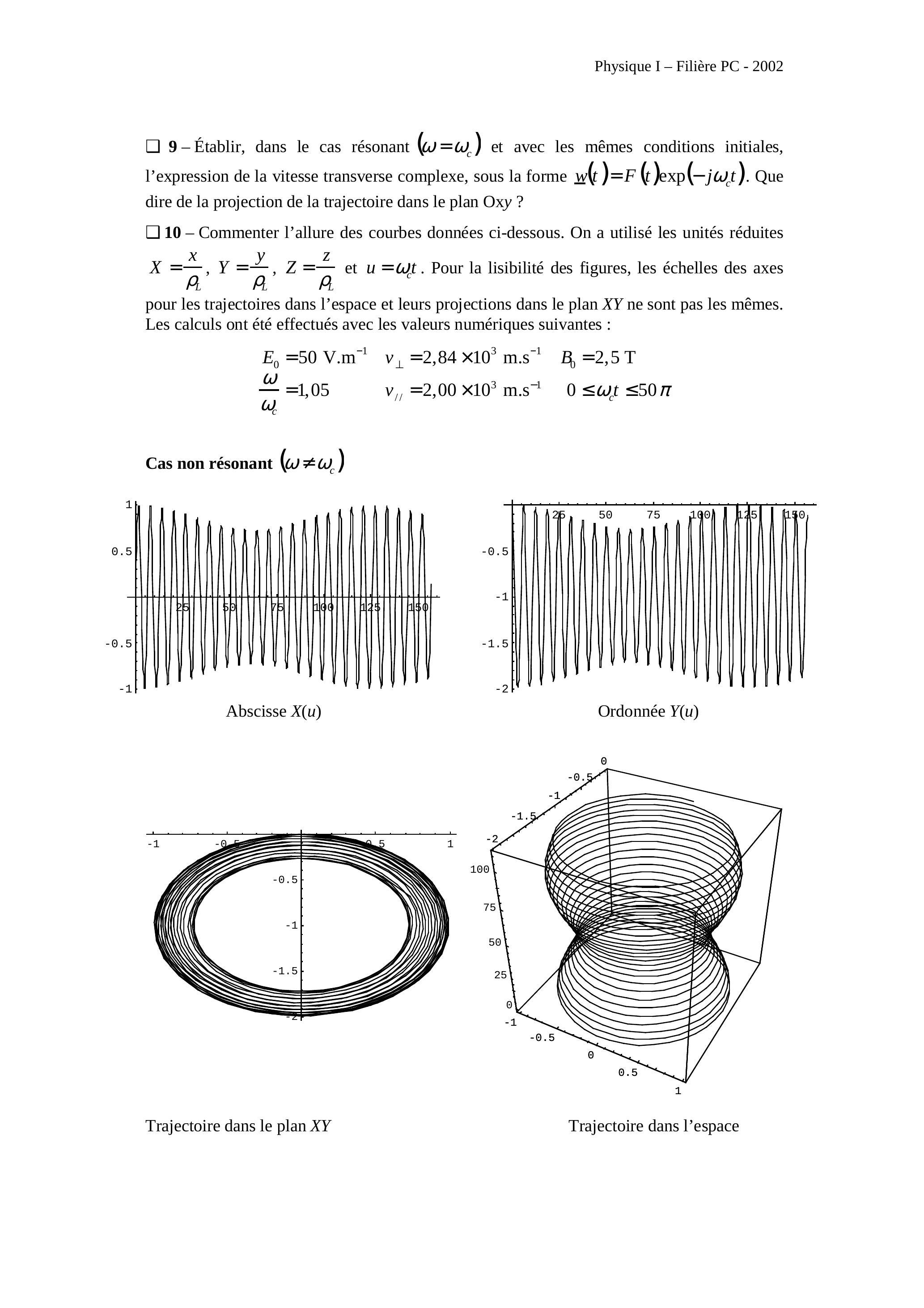 - Établir, dans le cas résonant et avec les mêmes conditions initiales, l'expression de la vitesse transverse complexe, sous la forme . Que dire de la projection de la trajectoire dans le plan Oxy ?