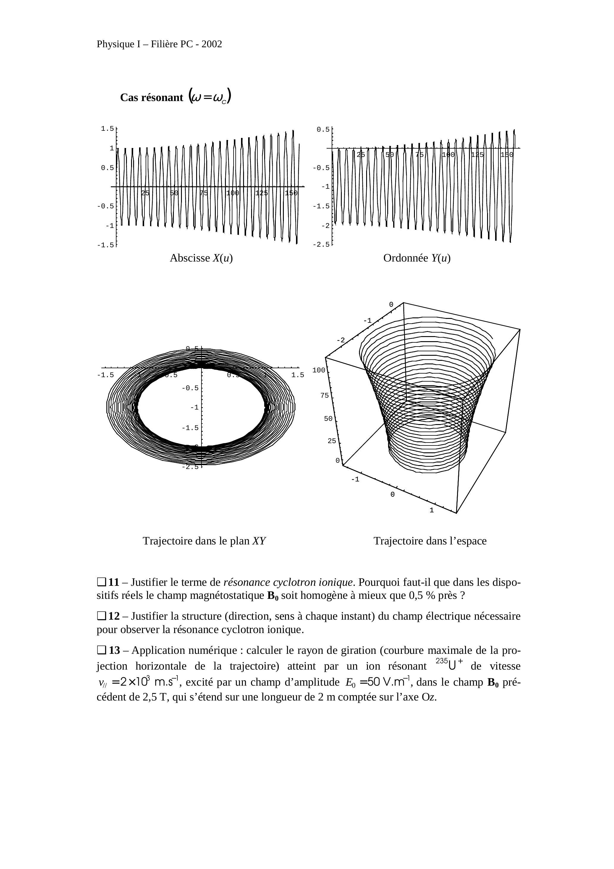 13 - Application numérique : calculer le rayon de giration (courbure maximale de la projection horizontale de la trajectoire) atteint par un ion résonant de vitesse , excité par un champ d'amplitude , dans le champ précédent de , qui s'étend sur une longueur de 2 m comptée sur l'axe Oz .
