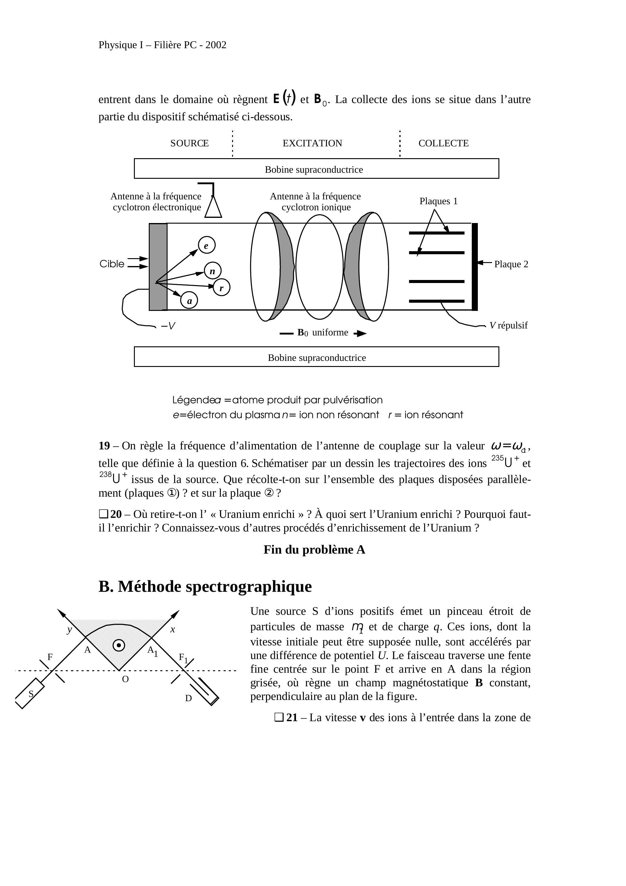 27 - L'intensité du faisceau est . La source est alimentée en Uranium naturel contenant de et . Quelle quantité de l'isotope pour-rait-on isoler ici en une année de fonctionnement continu? Quels avantages et quels inconvénients voyez-vous à ce dispositif de séparation des isotopes de l'uranium ?