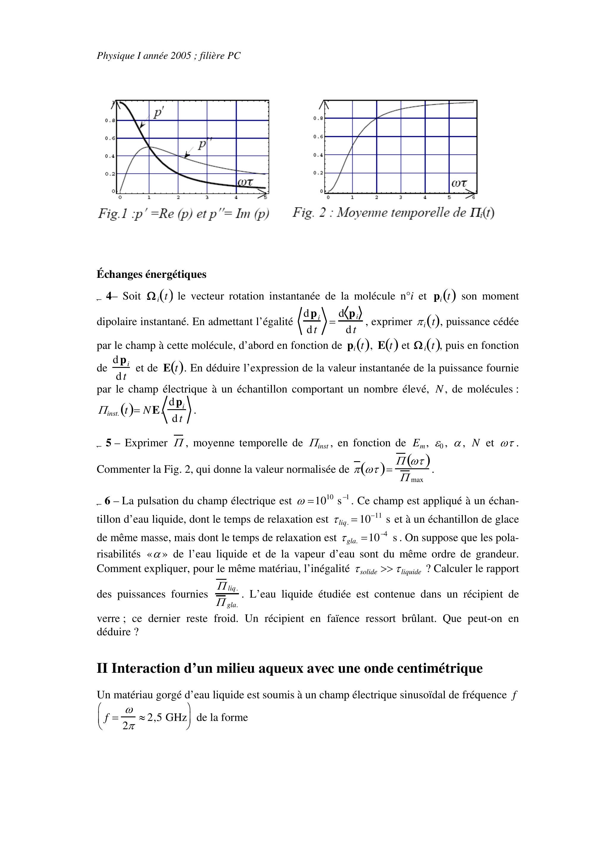 6 - La pulsation du champ électrique est . Ce champ est appliqué à un échantillon d'eau liquide, dont le temps de relaxation est et à un échantillon de glace de même masse, mais dont le temps de relaxation est . On suppose que les polarisabilités « de l'eau liquide et de la vapeur d'eau sont du même ordre de grandeur. Comment expliquer, pour le même matériau, l'inégalité ? Calculer le rapport des puissances fournies . L'eau liquide étudiée est contenue dans un récipient de verre; ce dernier reste froid. Un récipient en faïence ressort brûlant. Que peut-on en déduire?