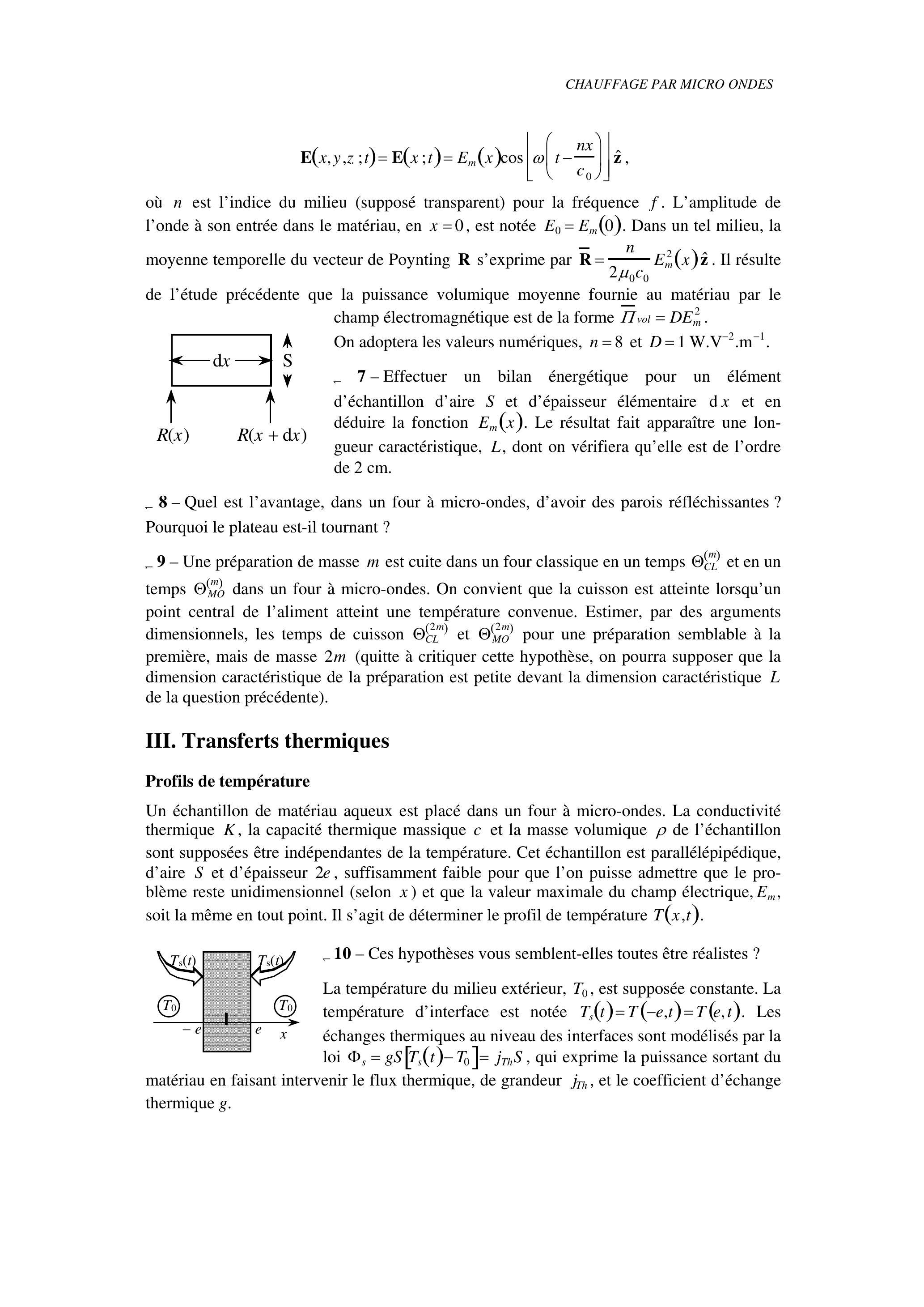 Un échantillon de matériau aqueux est placé dans un four à micro-ondes. La conductivité thermique , la capacité thermique massique et la masse volumique de l'échantillon sont supposées être indépendantes de la température. Cet échantillon est parallélépipédique, d'aire et d'épaisseur , suffisamment faible pour que l'on puisse admettre que le problème reste unidimensionnel (selon ) et que la valeur maximale du champ électrique, , soit la même en tout point. Il s'agit de déterminer le profil de température .