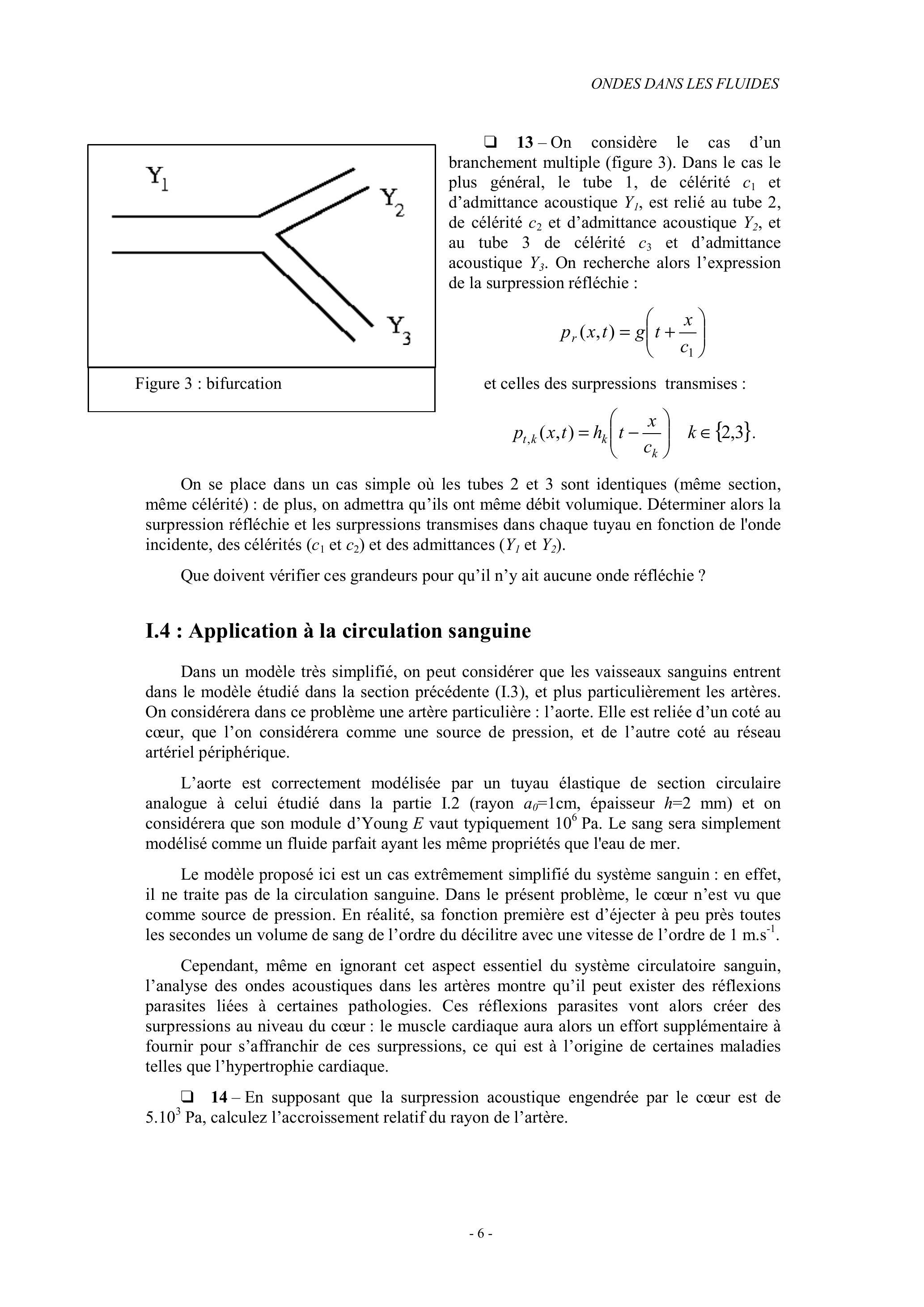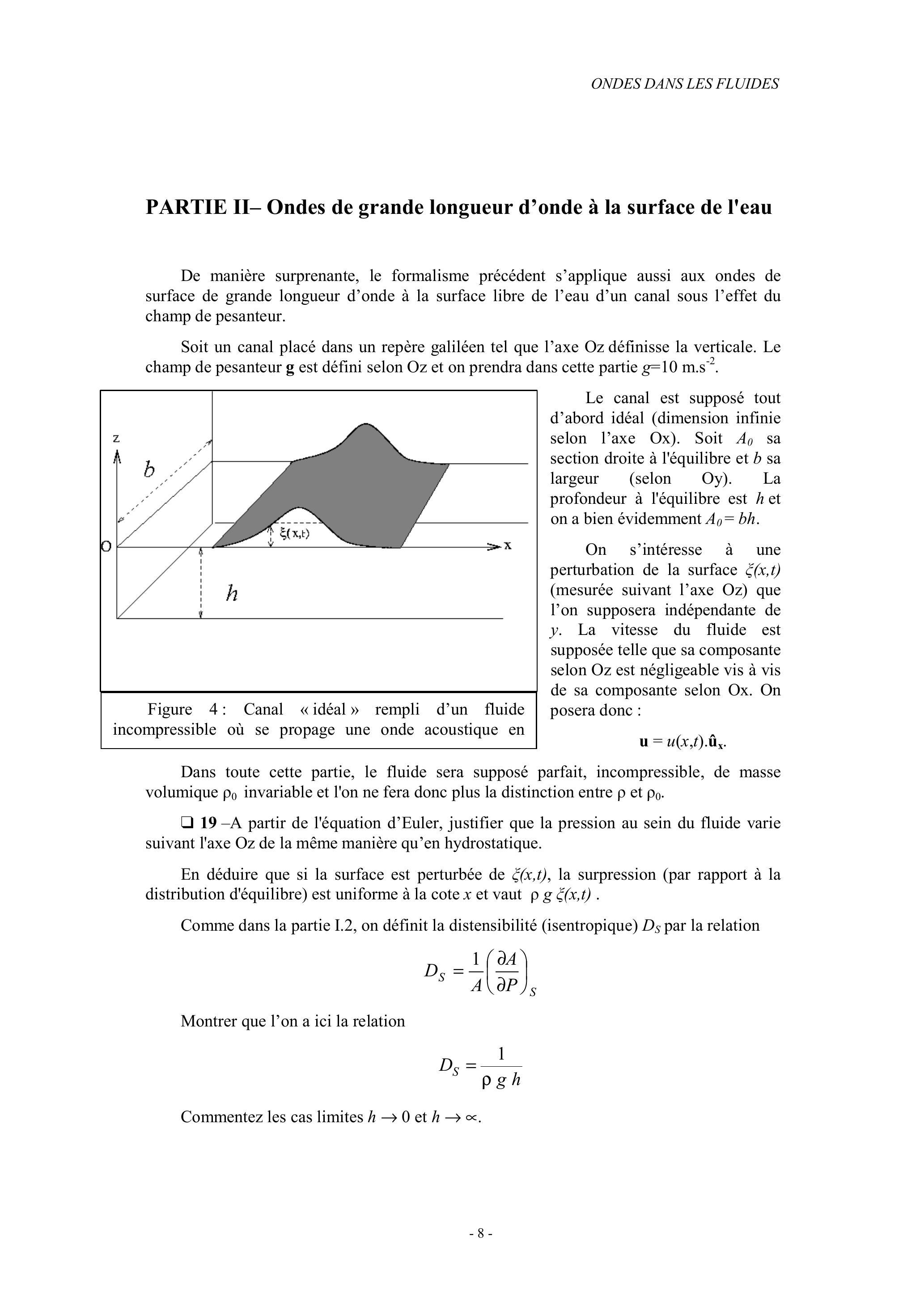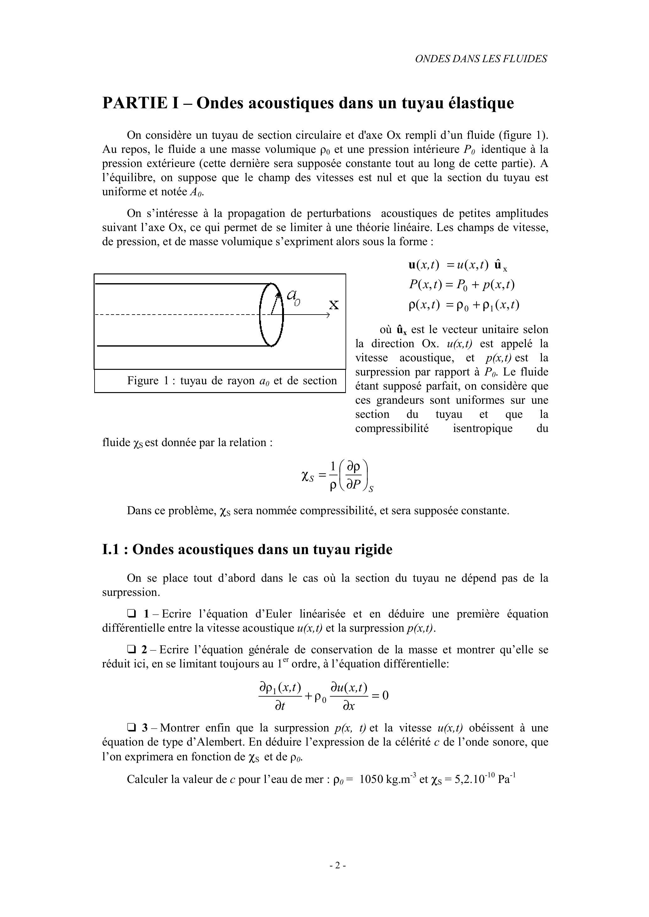 Ce problème est dédié à la propagation d'ondes acoustiques dans les fluides. La première partie porte sur la propagation d'ondes dans des tuyaux à section circulaires dits élastiques, c'est-à-dire tels que le rayon varie avec la pression. Le modèle qui peut alors s'en déduire est bien adapté à l'étude du système artériel car il permet de mettre en évidence un lien entre certains dysfonctionnements des artères et certaines pathologies cardiaques. La seconde partie porte sur la propagation d'ondes à la surface de l'eau (cas dans lequel entre, par exemple, la propagation d'un raz de marée ou «tsunami»).