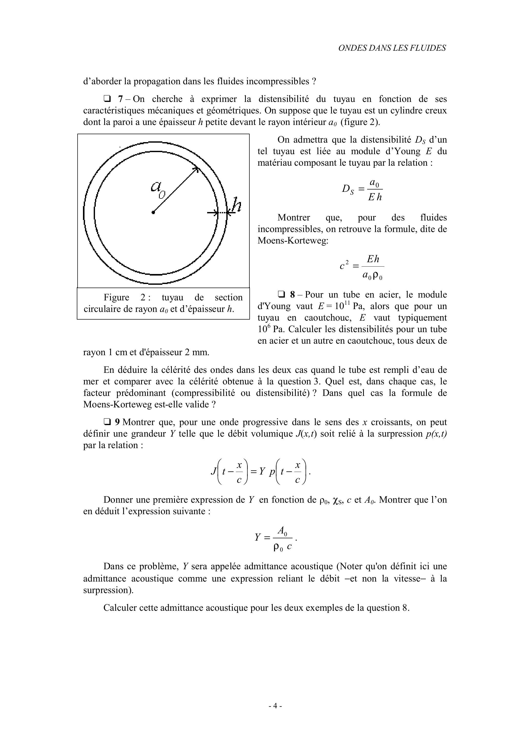 d'aborder la propagation dans les fluides incompressibles? On cherche à exprimer la distensibilité du tuyau en fonction de ses caractéristiques mécaniques et géométriques. On suppose que le tuyau est un cylindre creux dont la paroi a une épaisseur petite devant le rayon intérieur (figure 2).