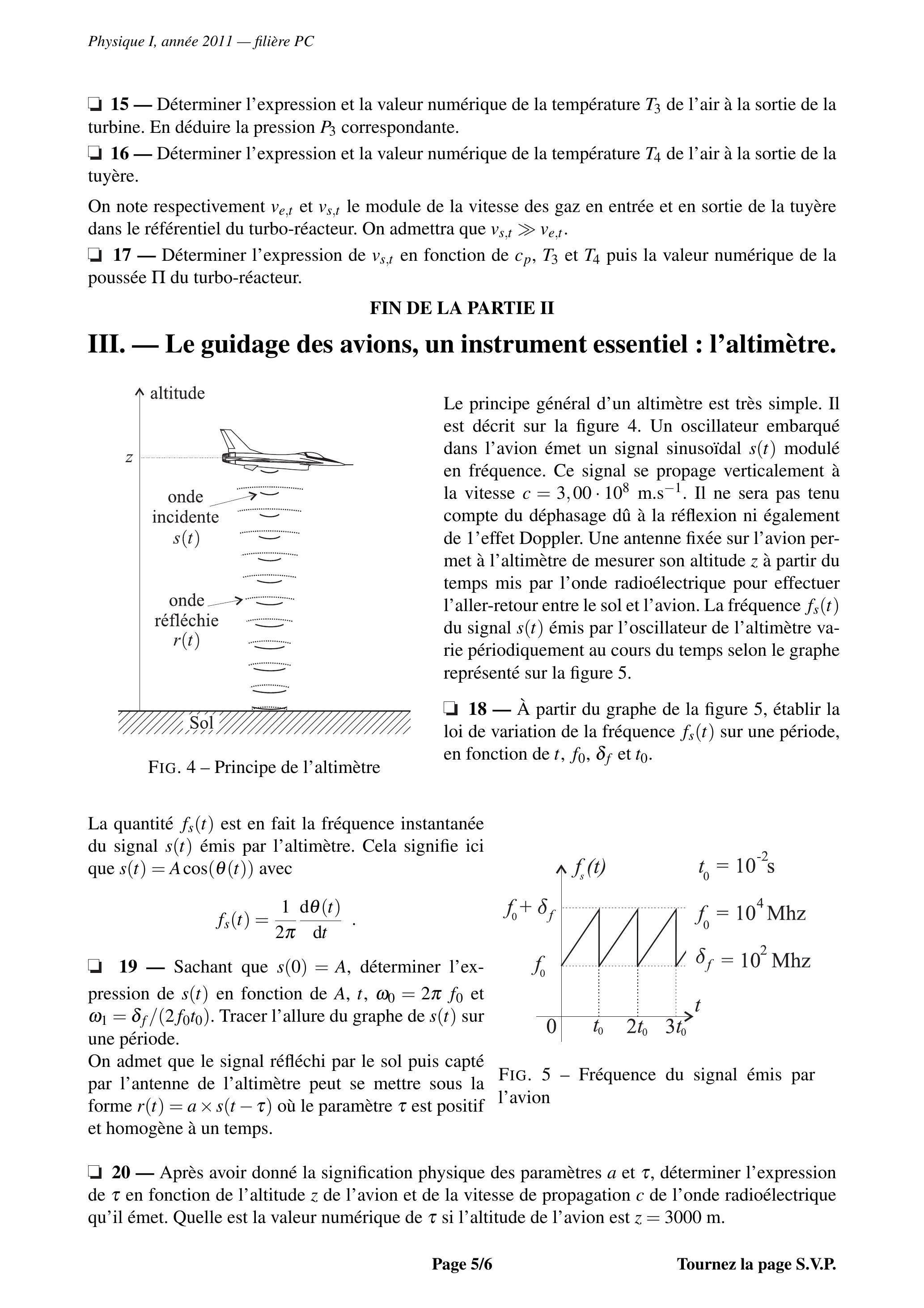 Le principe général d'un altimètre est très simple. Il est décrit sur la figure 4. Un oscillateur embarqué dans l'avion émet un signal sinusoïdal modulé en fréquence. Ce signal se propage verticalement à la vitesse . Il ne sera pas tenu compte du déphasage dû à la réflexion ni également de l'effet Doppler. Une antenne fixée sur l'avion permet à l'altimètre de mesurer son altitude à partir du temps mis par l'onde radioélectrique pour effectuer l'aller-retour entre le sol et l'avion. La fréquence du signal émis par l'oscillateur de l'altimètre varie périodiquement au cours du temps selon le graphe représenté sur la figure 5.