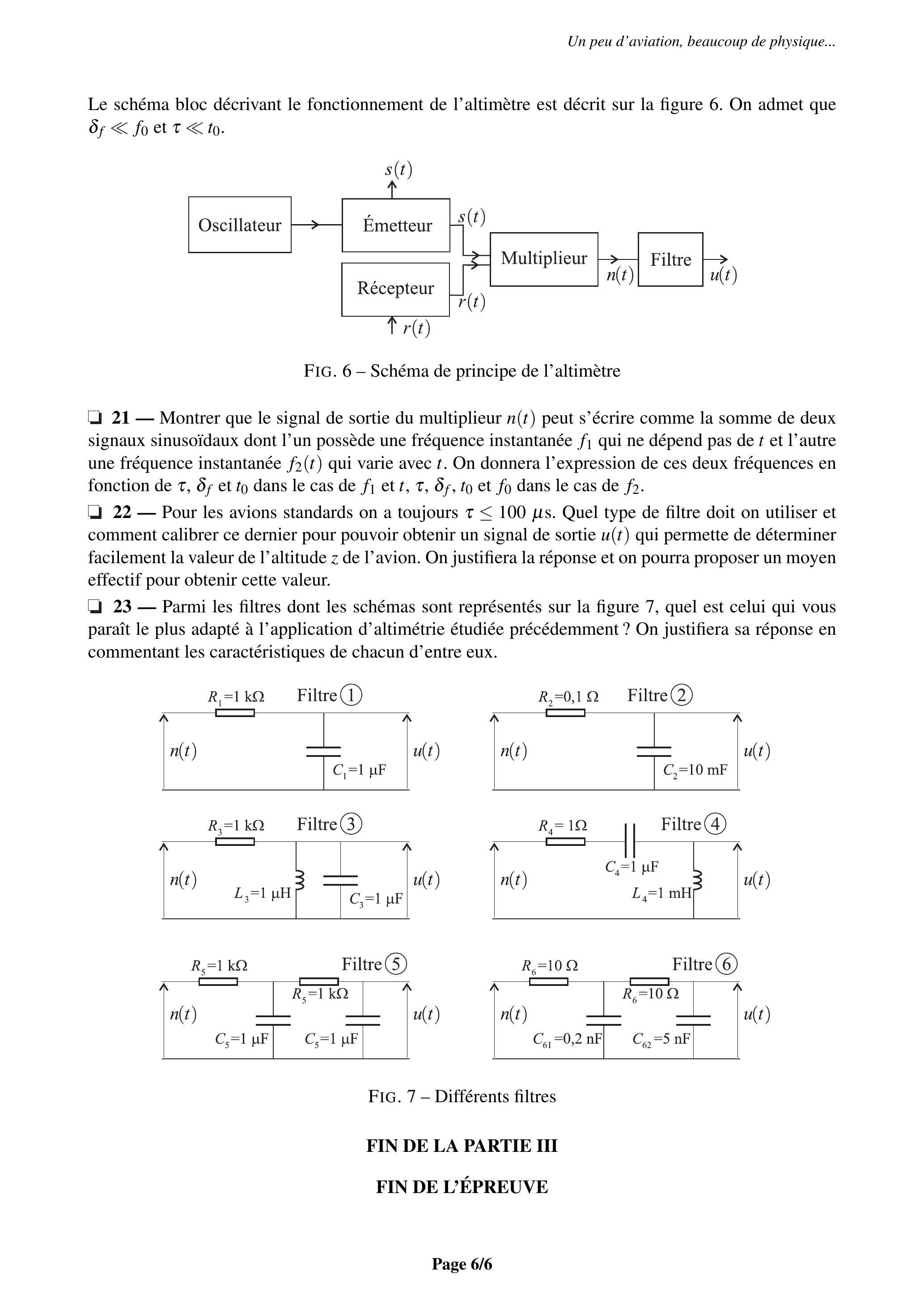 21 - Montrer que le signal de sortie du multiplieur peut s'écrire comme la somme de deux signaux sinusoïdaux dont l'un possède une fréquence instantanée qui ne dépend pas de et l'autre une fréquence instantanée qui varie avec . On donnera l'expression de ces deux fréquences en fonction de et dans le cas de et et dans le cas de . - Pour les avions standards on a toujours . Quel type de filtre doit on utiliser et comment calibrer ce dernier pour pouvoir obtenir un signal de sortie qui permette de déterminer facilement la valeur de l'altitude de l'avion. On justifiera la réponse et on pourra proposer un moyen effectif pour obtenir cette valeur.