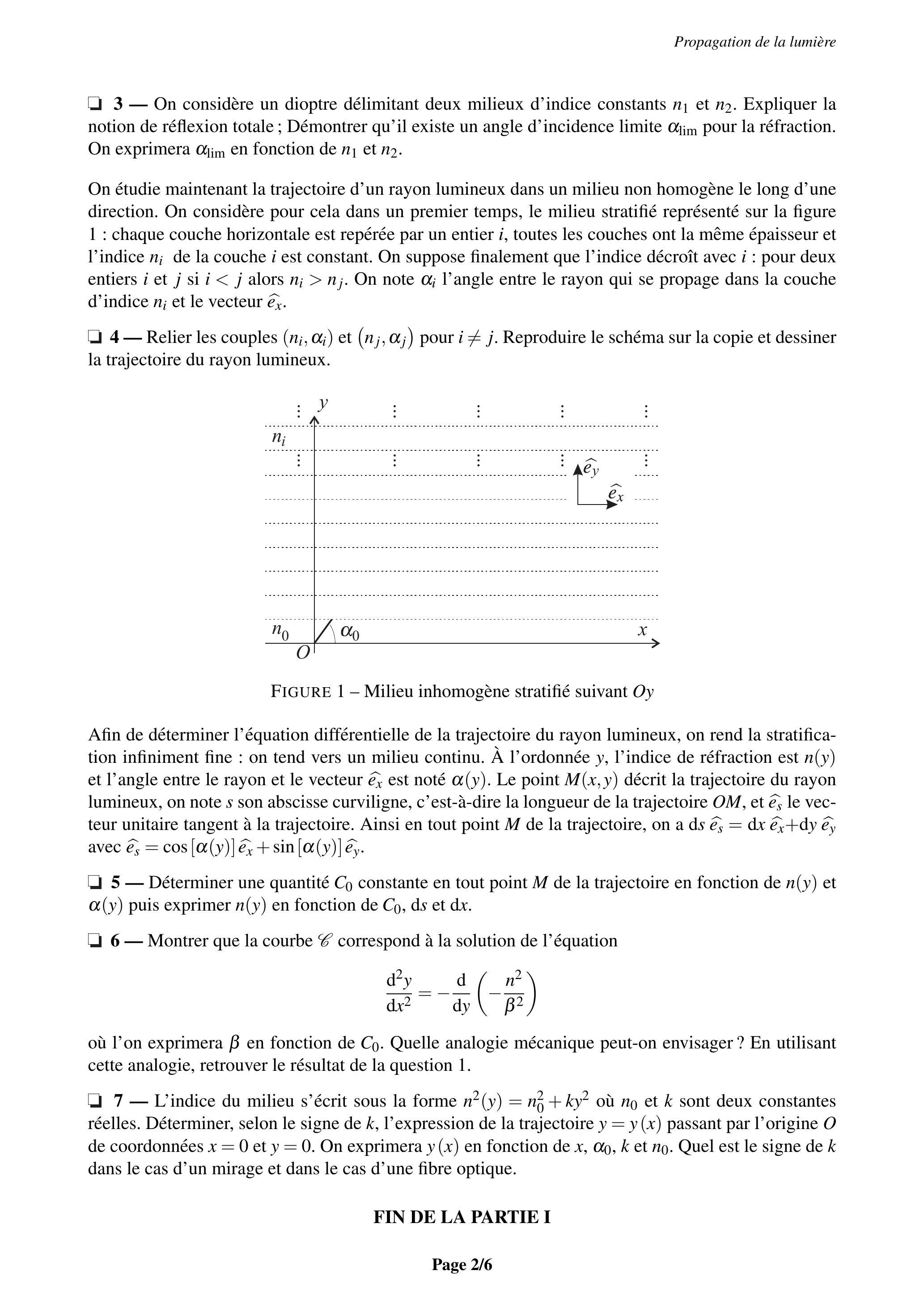 On étudie maintenant la trajectoire d'un rayon lumineux dans un milieu non homogène le long d'une direction. On considère pour cela dans un premier temps, le milieu stratifié représenté sur la figure 1 : chaque couche horizontale est repérée par un entier , toutes les couches ont la même épaisseur et l'indice de la couche est constant. On suppose finalement que l'indice décroît avec : pour deux entiers et si alors . On note l'angle entre le rayon qui se propage dans la couche d'indice et le vecteur .