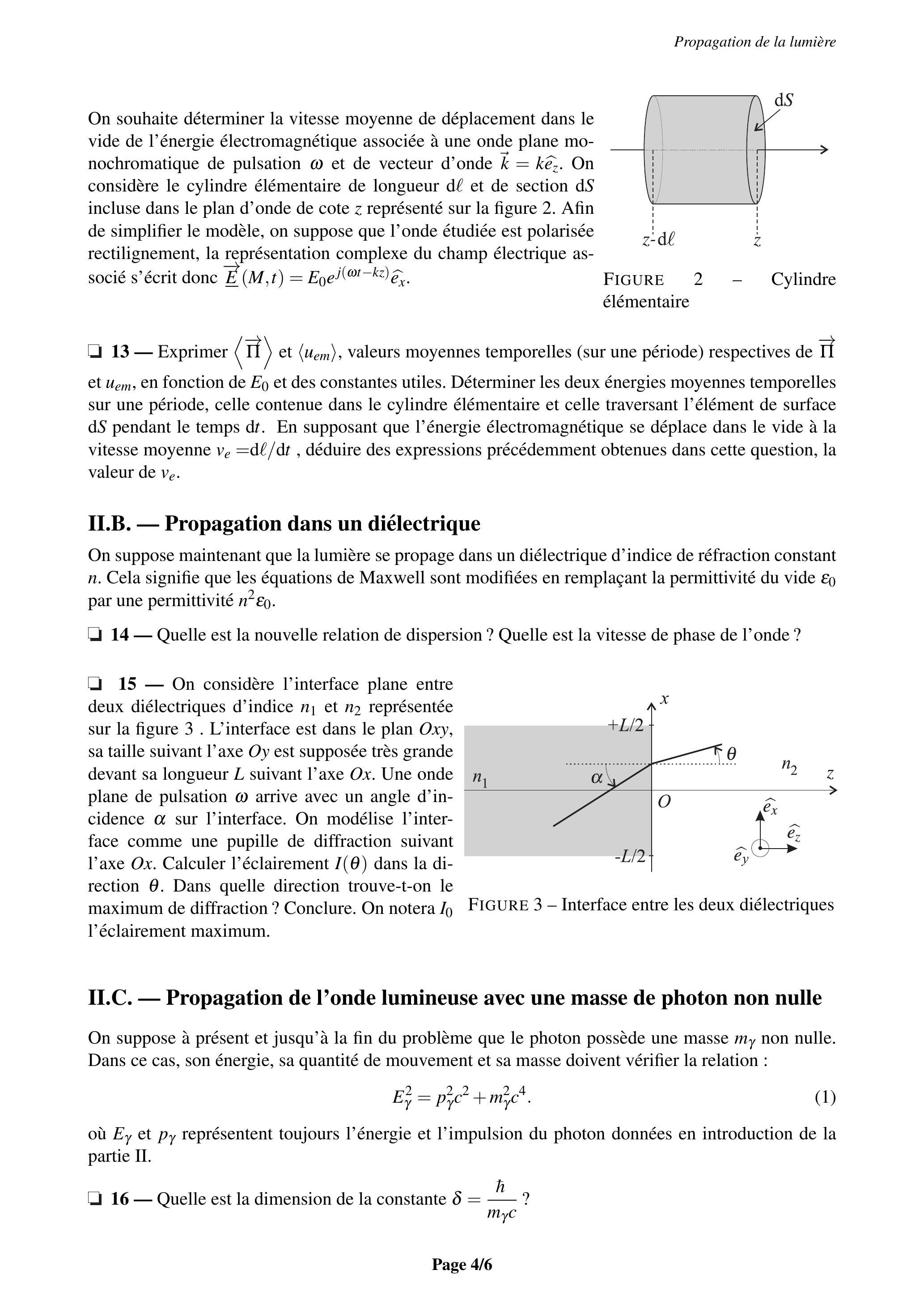 L'objectif de ce problème est d'étudier différents aspects de la propagation de la lumière. Dans une première partie on étudiera le modèle géométrique de la lumière. Dans une deuxième partie, on modélisera la lumière par une onde ce qui permettra d'introduire une particule appelée photon. On évoquera finalement la possibilité d'une éventuelle masse pour ce photon et on essaiera d'en tirer les conséquences.