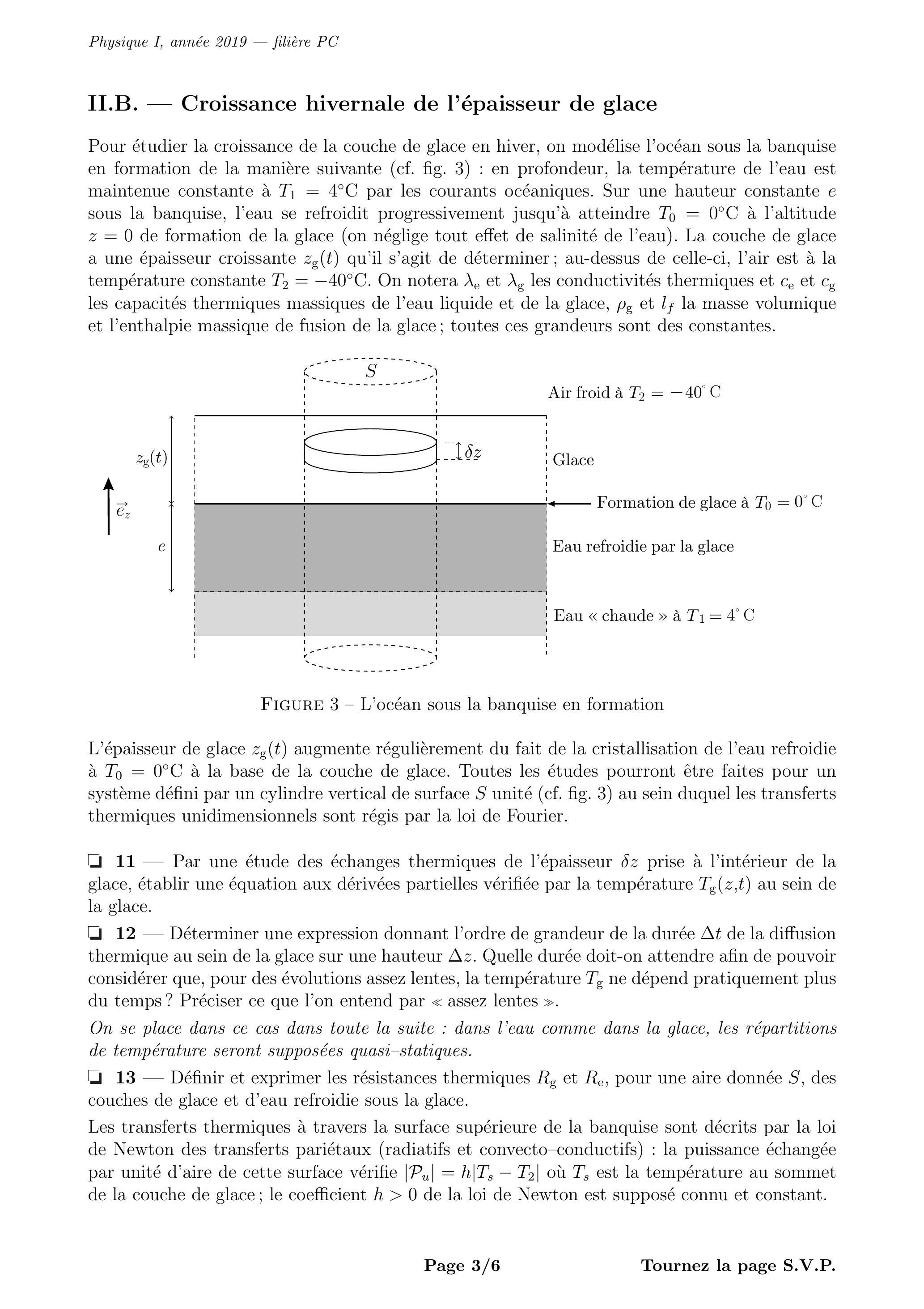 Pour étudier la croissance de la couche de glace en hiver, on modélise l'océan sous la banquise en formation de la manière suivante (cf. fig. 3) : en profondeur, la température de l'eau est maintenue constante à par les courants océaniques. Sur une hauteur constante sous la banquise, l'eau se refroidit progressivement jusqu'à atteindre à l'altitude de formation de la glace (on néglige tout effet de salinité de l'eau). La couche de glace a une épaisseur croissante qu'il s'agit de déterminer; au-dessus de celle-ci, l'air est à la température constante . On notera et les conductivités thermiques et et les capacités thermiques massiques de l'eau liquide et de la glace, et la masse volumique et l'enthalpie massique de fusion de la glace; toutes ces grandeurs sont des constantes.