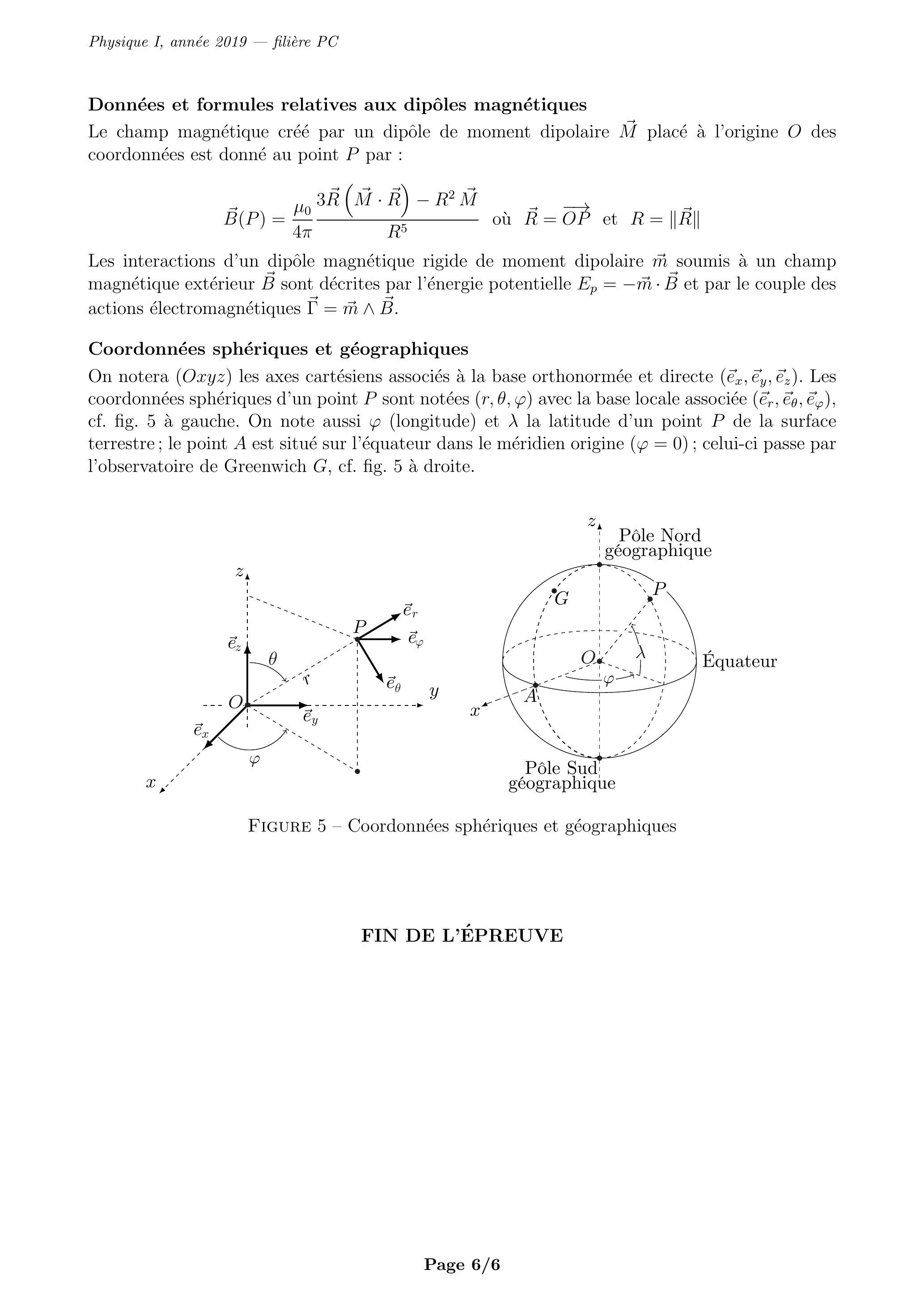 On étudie un modèle de champ géomagnétique créé par un dipôle magnétique disposé au centre de la Terre (assimilée à une sphère de rayon ), l'axe ( ) étant l'axe polaire géographique dirigé du pôle sud de cet axe vers son pôle nord (cf. fig. 5). On rappelle d'une part qu'un point de la surface est caractérisé par ses coordonnées géographiques (longitude) et (latitude) et d'autre part qu'à l'équateur le champ magnétique terrestre est horizontal, dirigé vers le pôle nord géographique et y a pour intensité .