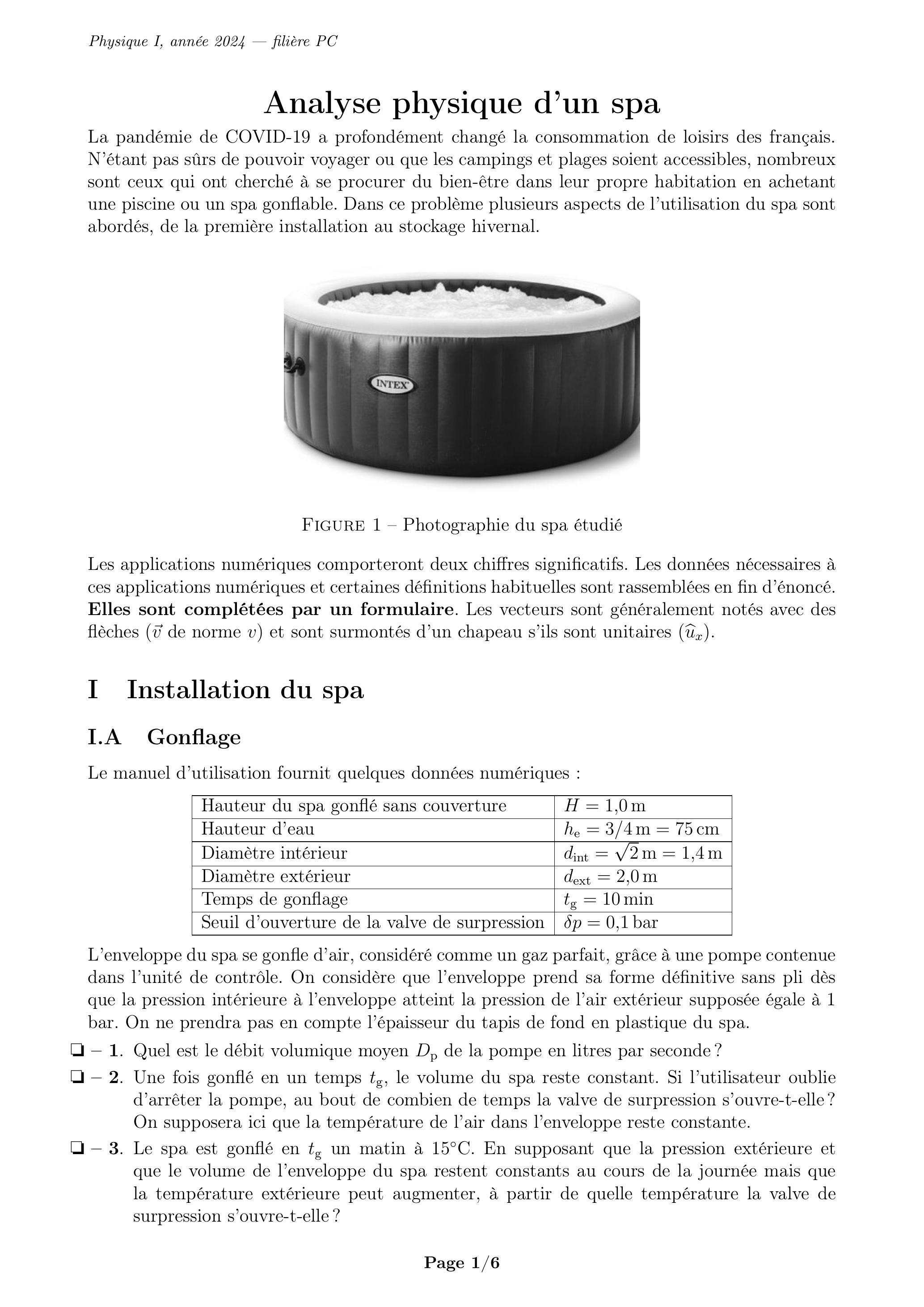 L'enveloppe du spa se gonfle d'air, considéré comme un gaz parfait, grâce à une pompe contenue dans l'unité de contrôle. On considère que l'enveloppe prend sa forme définitive sans pli dès que la pression intérieure à l'enveloppe atteint la pression de l'air extérieur supposée égale à 1 bar. On ne prendra pas en compte l'épaisseur du tapis de fond en plastique du spa.