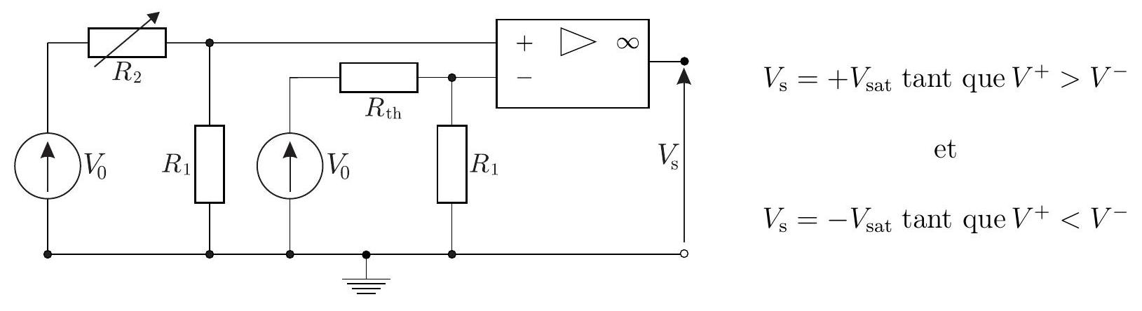 On s'intéresse au mode «maintien de température » de l'unité de contrôle, utilisé lorsque l'eau du spa a déjà été chauffée à la température souhaitée. Ce mode maintient la température dans l'intervalle [ ], où . On a donc besoin de deux interrupteurs commandés en température. Un montage possible pour un interrupteur est donné sur la figure 2 , où les deux générateurs de tension constante sont identiques. L'Amplificateur Linéaire Intégré (ALI) idéal fonctionne ici en saturation, il n'a alors que deux tensions de sorties possibles , cette caractéristique permet de commander un dispositif, non étudié ici, créant une fonction ON/OFF pour le chauffage.