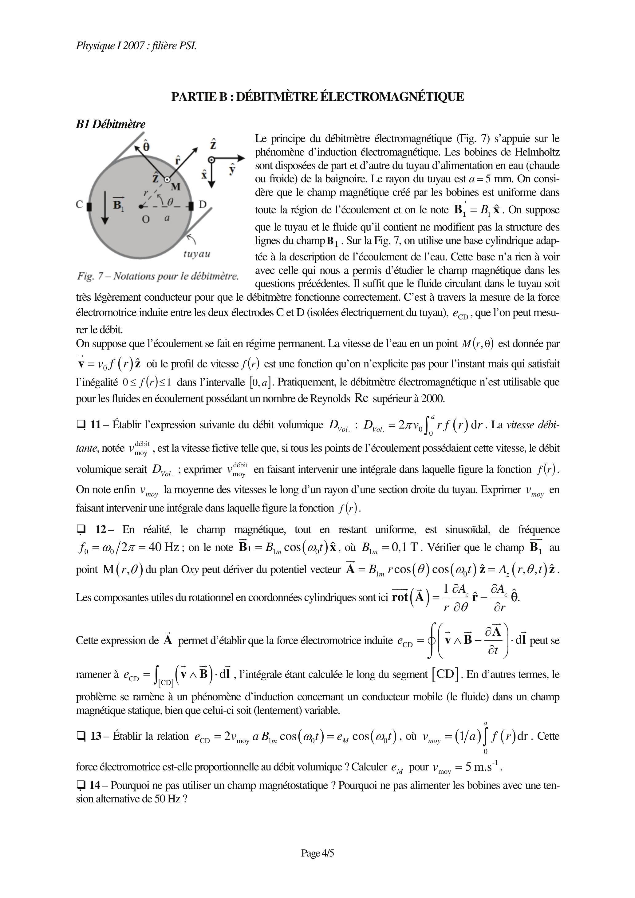 17 - Admettons maintenant que l'on puisse confondre et é. Établir alors l'expression de la force électromotrice induite en fonction du débit volumique . La valeur maximum de la tension mesurée entre les électrodes C et D est 7 mV . Combien faut-il de temps pour que la baignoire contienne 100 L d'eau?