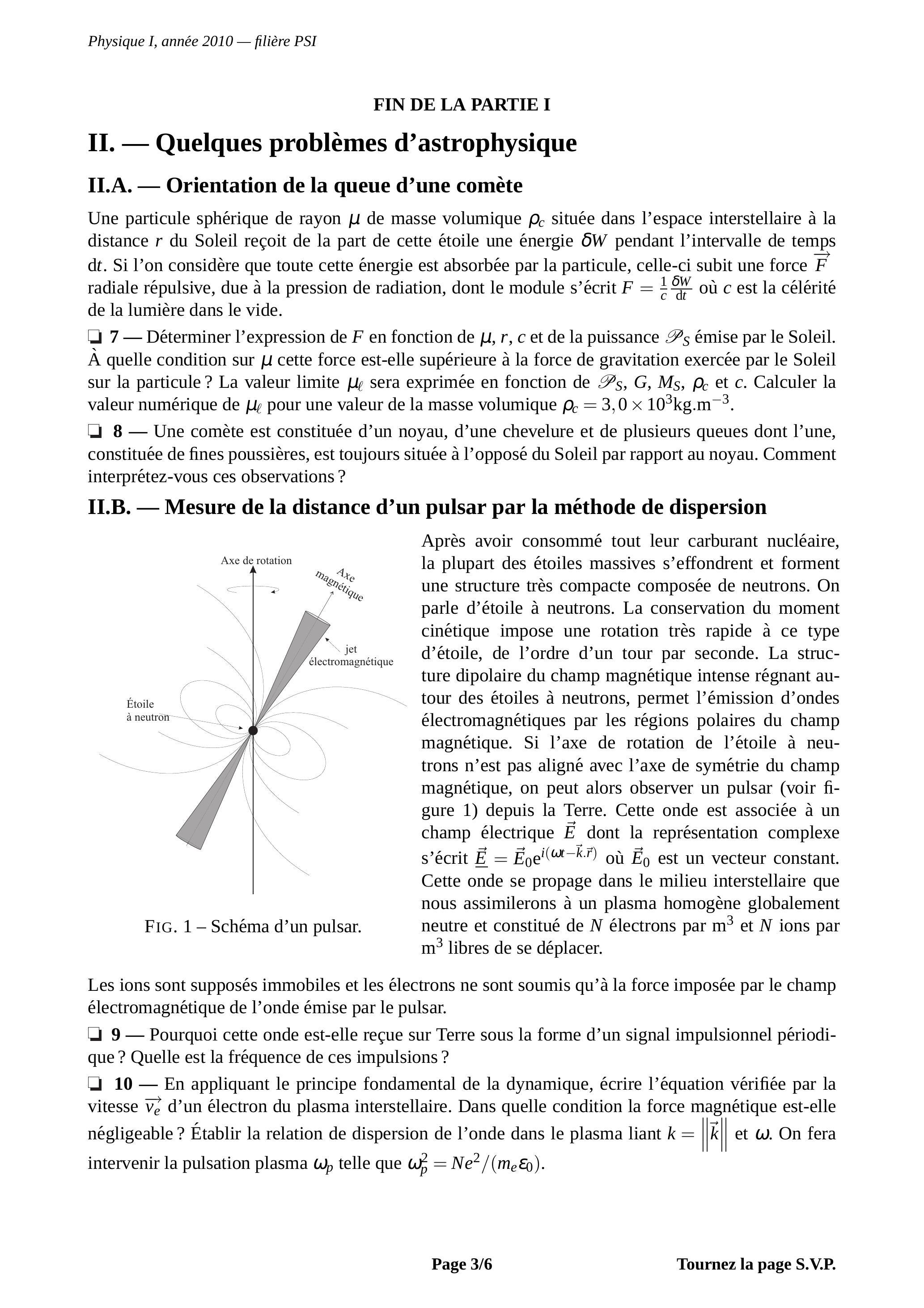 Ce problème se propose d'étudier dans un premier temps la formation et l'évolution d'une étoile et de s'intéresser ensuite à différents objets célestes tels que les comètes, les pulsars et les exoplanètes. Toutes les sous-parties sont indépendantes entre elles. Les données nécessaires aux applications numériques sont rassemblées à la fin du sujet. Les vecteurs sont notés avec un chapeau s'ils sont unitaires , avec une flèche dans le cas général. Hormis , les nombres complexes sont soulignés : .