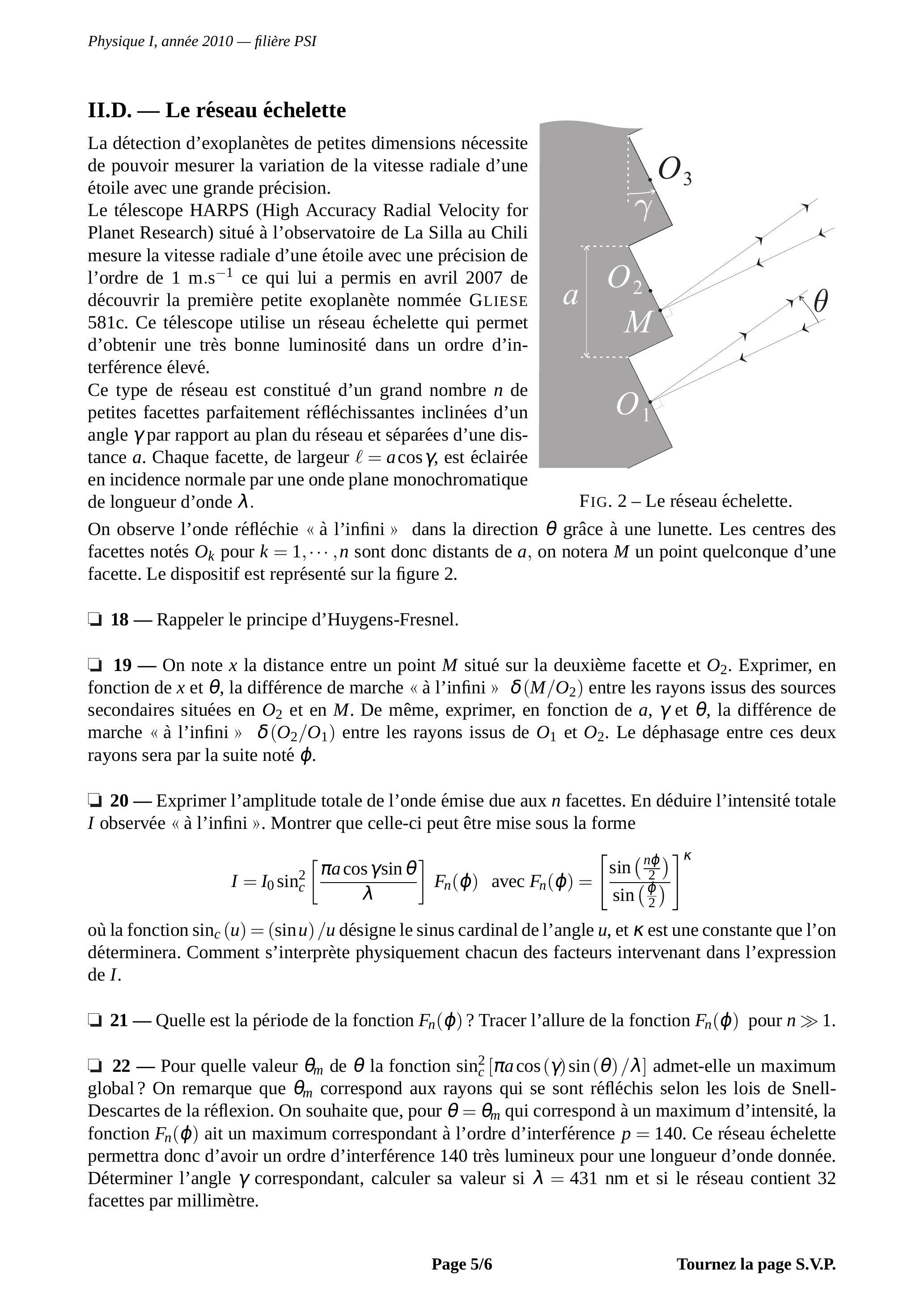 où la fonction désigne le sinus cardinal de l'angle , et est une constante que l'on déterminera. Comment s'interprète physiquement chacun des facteurs intervenant dans l'expression de . - Quelle est la période de la fonction ? Tracer l'allure de la fonction pour . - Pour quelle valeur de la fonction admet-elle un maximum global? On remarque que correspond aux rayons qui se sont réfléchis selon les lois de SnellDescartes de la réflexion. On souhaite que, pour qui correspond à un maximum d'intensité, la fonction ait un maximum correspondant à l'ordre d'interférence . Ce réseau échelette permettra donc d'avoir un ordre d'interférence 140 très lumineux pour une longueur d'onde donnée. Déterminer l'angle correspondant, calculer sa valeur si et si le réseau contient 32 facettes par millimètre. - La source d'une onde électromagnétique plane de longueur d'onde possède une vitesse radiale dans un référentiel galiléen d'origine . Du fait de l'effet de l'effet Doppler-Fizeau, un observateur fixe en mesure, pour la longueur de cette même onde, une valeur . En déduire l'expression de la variation en fonction de et de la variation . Pour l'étoile HD 209458, on veut pouvoir distinguer la variation de vitesse radiale lorsque la vitesse passe de à . On observe dans l'ordre deux la longueur d'onde avec le réseau échelette précédent. Déterminer l'expression de la variation de l'angle à la sortie du réseau associée à la variation observée pour HD 209458. Calculer numériquement la valeur de . - Lorsqu'on se place à un ordre élevé, on a un risque de chevauchement d'ordres. Quelles sont les longueurs d'onde et qui correspondraient à la même déviation que la longueur d'onde dans l'ordre 140 mais avec des ordres 139 et 141?
