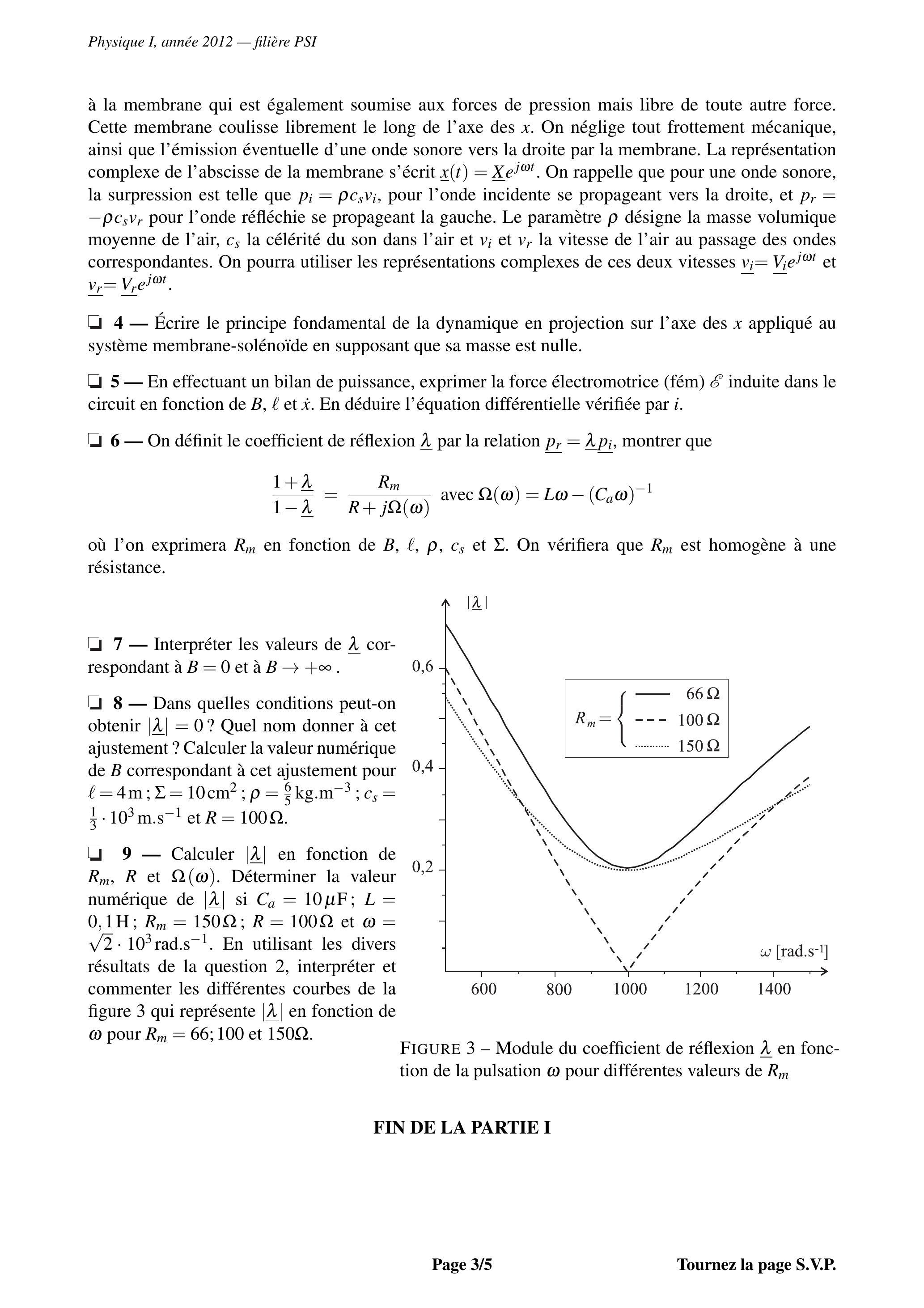 à la membrane qui est également soumise aux forces de pression mais libre de toute autre force. Cette membrane coulisse librement le long de l'axe des . On néglige tout frottement mécanique, ainsi que l'émission éventuelle d'une onde sonore vers la droite par la membrane. La représentation complexe de l'abscisse de la membrane s'écrit . On rappelle que pour une onde sonore, la surpression est telle que , pour l'onde incidente se propageant vers la droite, et pour l'onde réfléchie se propageant la gauche. Le paramètre désigne la masse volumique moyenne de l'air, la célérité du son dans l'air et et la vitesse de l'air au passage des ondes correspondantes. On pourra utiliser les représentations complexes de ces deux vitesses et .