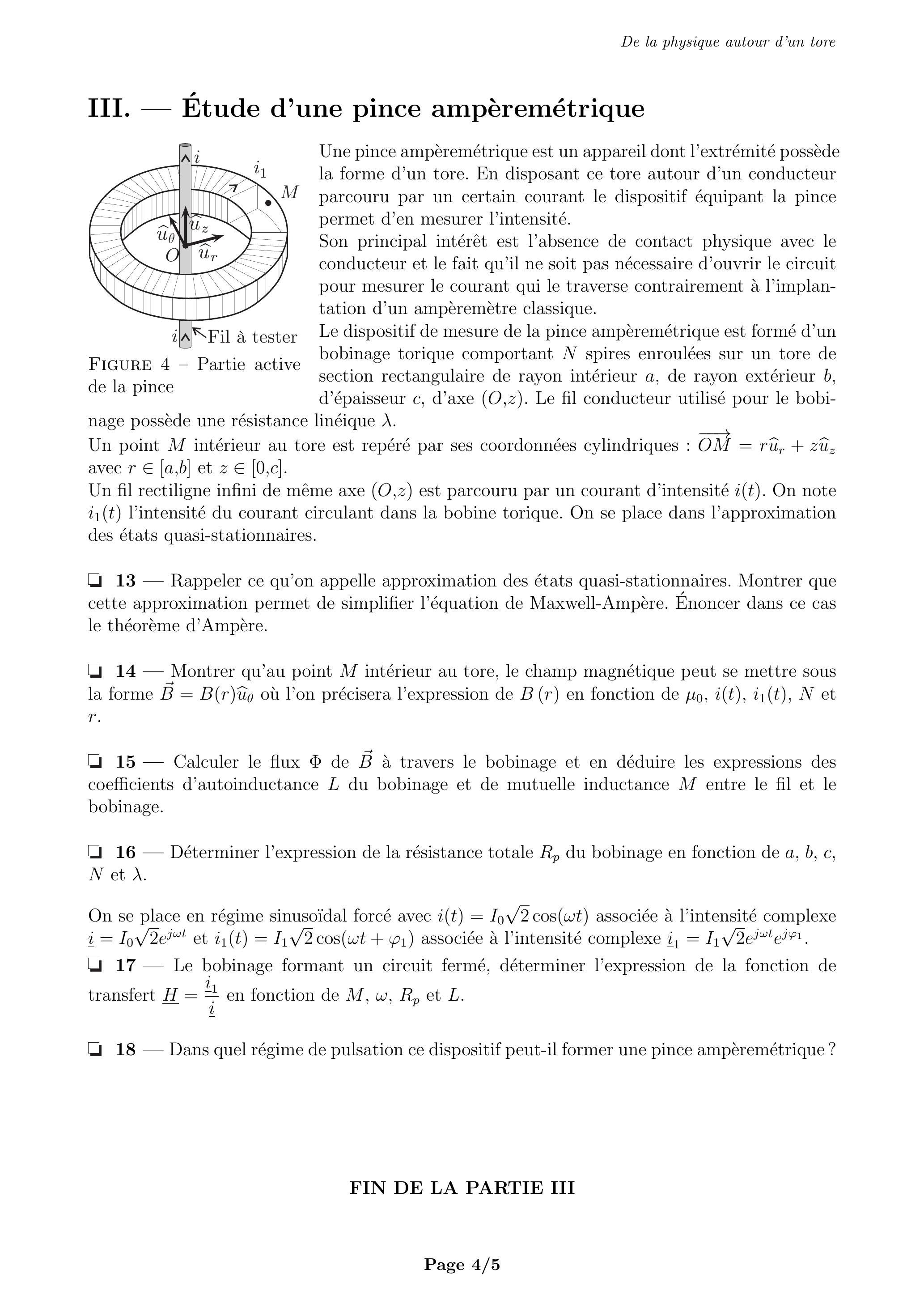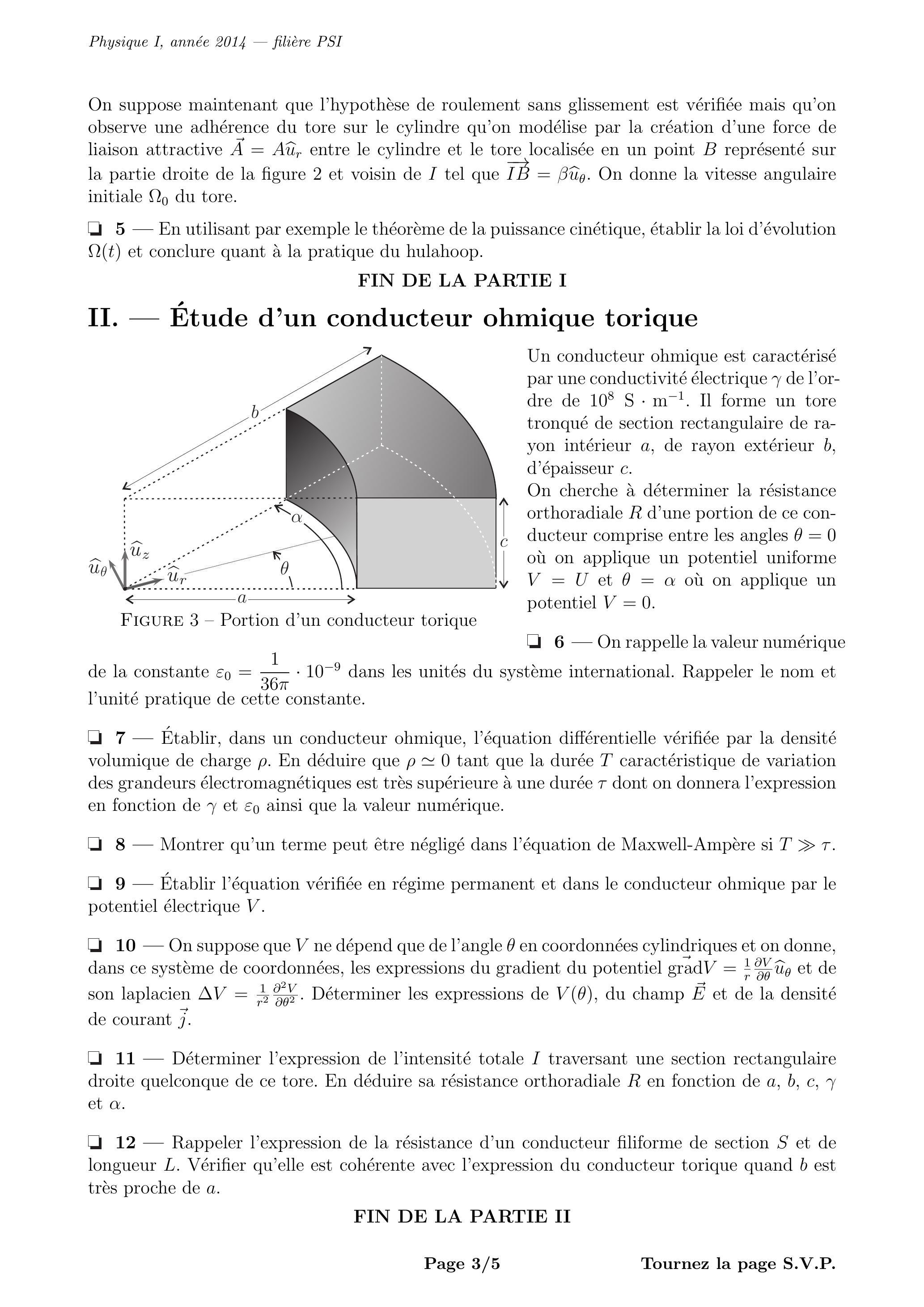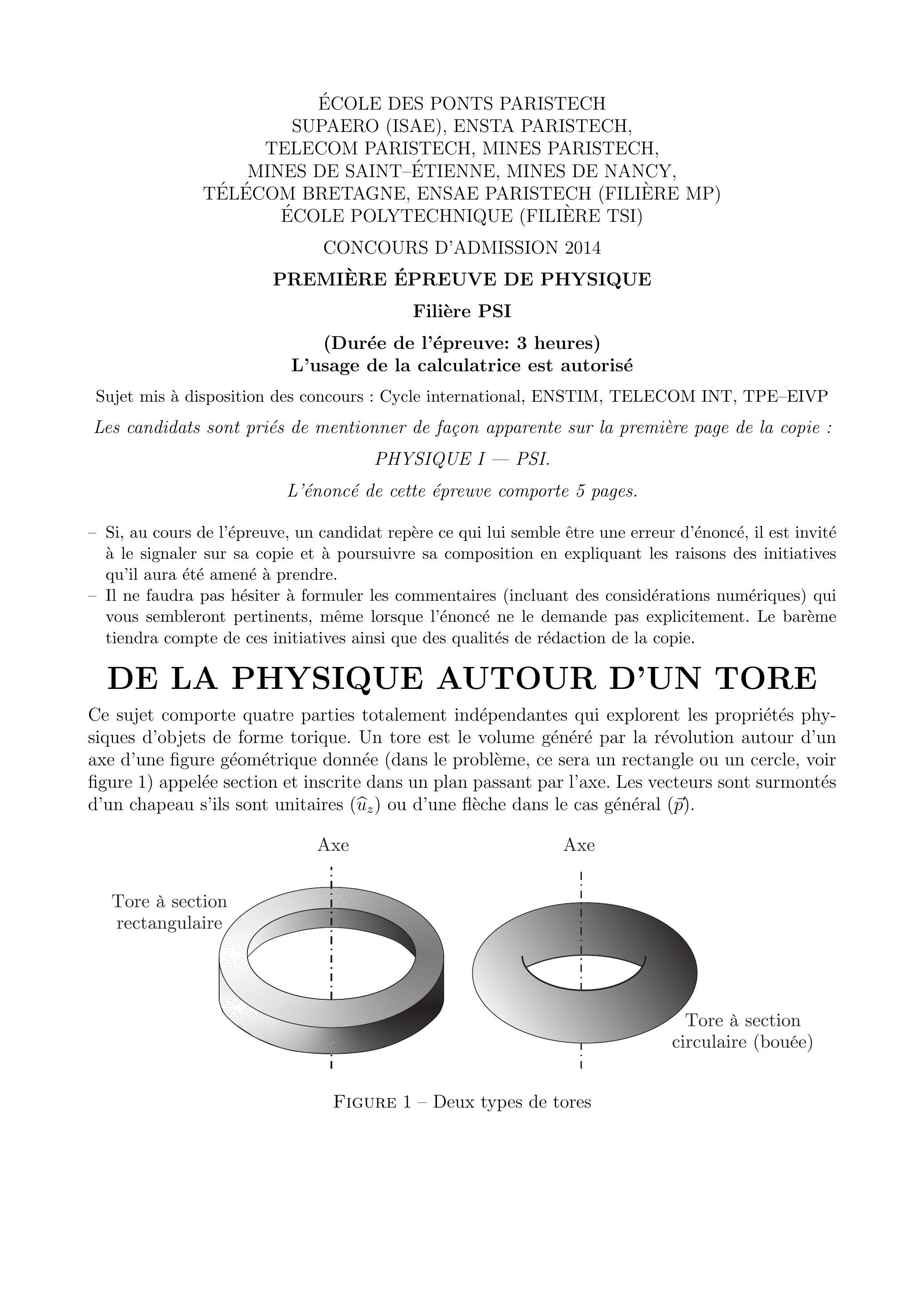 Ce sujet comporte quatre parties totalement indépendantes qui explorent les propriétés physiques d'objets de forme torique. Un tore est le volume généré par la révolution autour d'un axe d'une figure géométrique donnée (dans le problème, ce sera un rectangle ou un cercle, voir figure 1) appelée section et inscrite dans un plan passant par l'axe. Les vecteurs sont surmontés d'un chapeau s'ils sont unitaires ( ) ou d'une flèche dans le cas général ( ).
