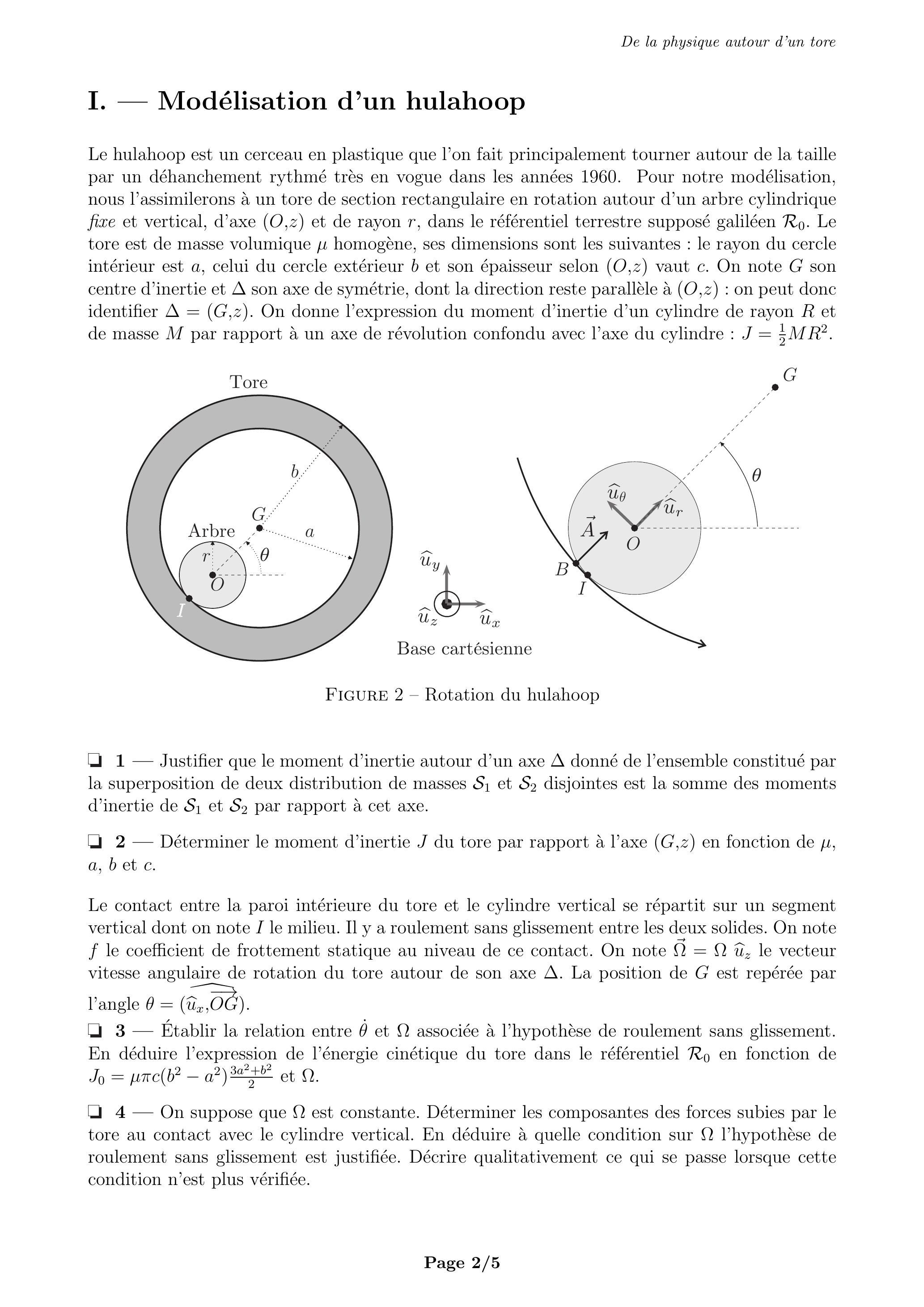 Le hulahoop est un cerceau en plastique que l'on fait principalement tourner autour de la taille par un déhanchement rythmé très en vogue dans les années 1960. Pour notre modélisation, nous l'assimilerons à un tore de section rectangulaire en rotation autour d'un arbre cylindrique fixe et vertical, d'axe ( ) et de rayon , dans le référentiel terrestre supposé galiléen . Le tore est de masse volumique homogène, ses dimensions sont les suivantes : le rayon du cercle intérieur est , celui du cercle extérieur et son épaisseur selon vaut . On note son centre d'inertie et son axe de symétrie, dont la direction reste parallèle à ( ) : on peut donc identifier . On donne l'expression du moment d'inertie d'un cylindre de rayon et de masse par rapport à un axe de révolution confondu avec l'axe du cylindre : .