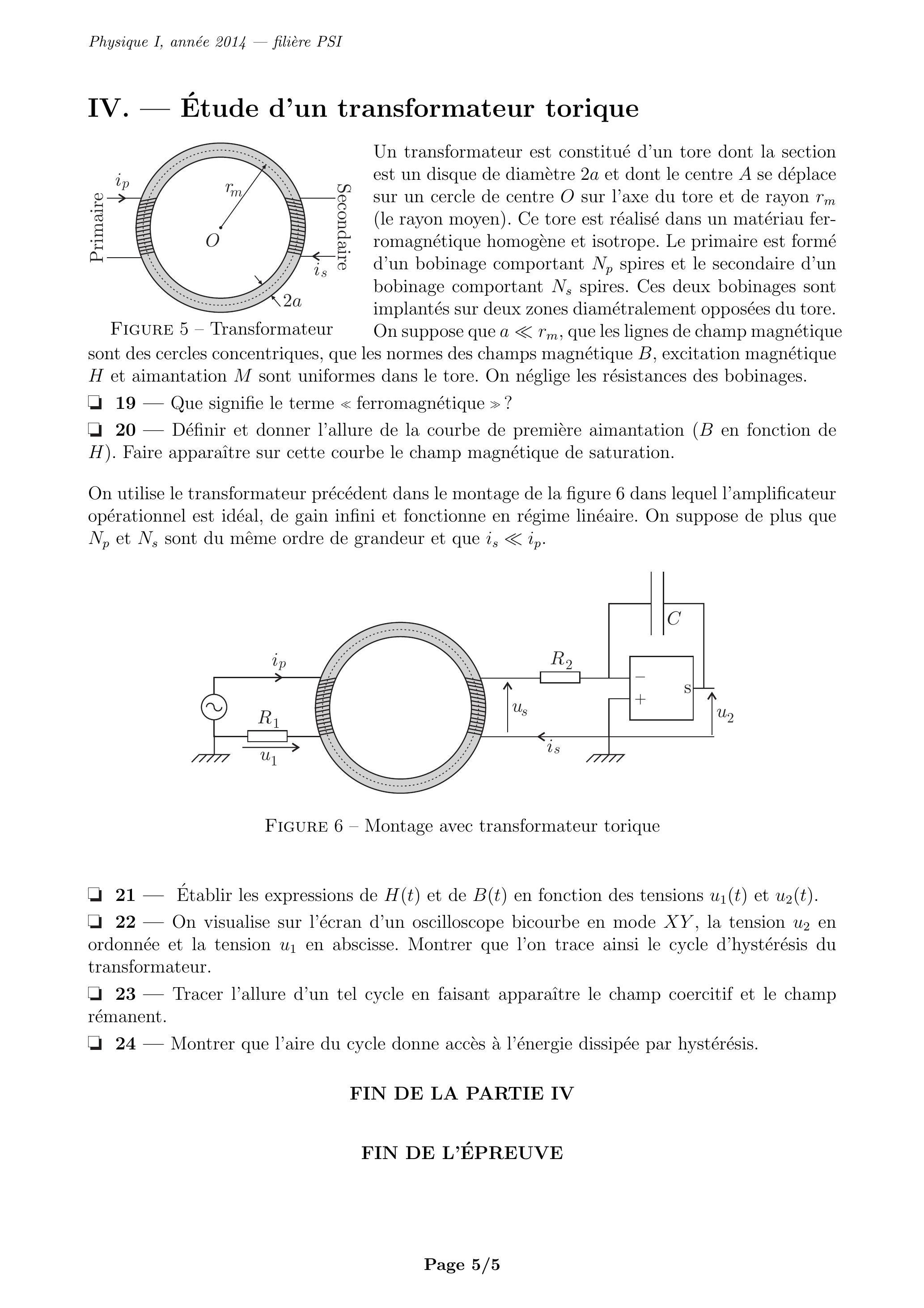 Un transformateur est constitué d'un tore dont la section est un disque de diamètre et dont le centre se déplace sur un cercle de centre sur l'axe du tore et de rayon (le rayon moyen). Ce tore est réalisé dans un matériau ferromagnétique homogène et isotrope. Le primaire est formé d'un bobinage comportant spires et le secondaire d'un bobinage comportant spires. Ces deux bobinages sont implantés sur deux zones diamétralement opposées du tore.