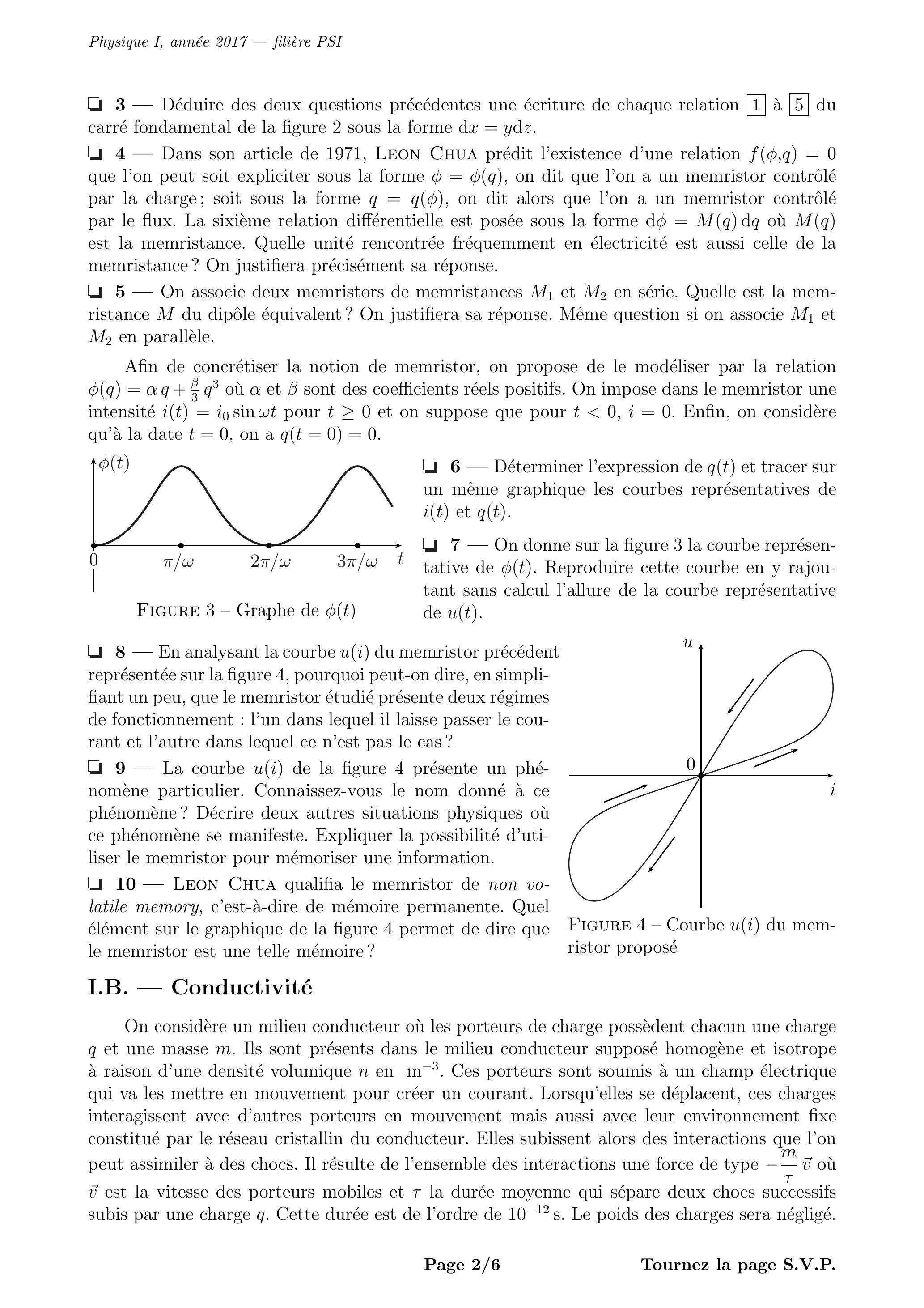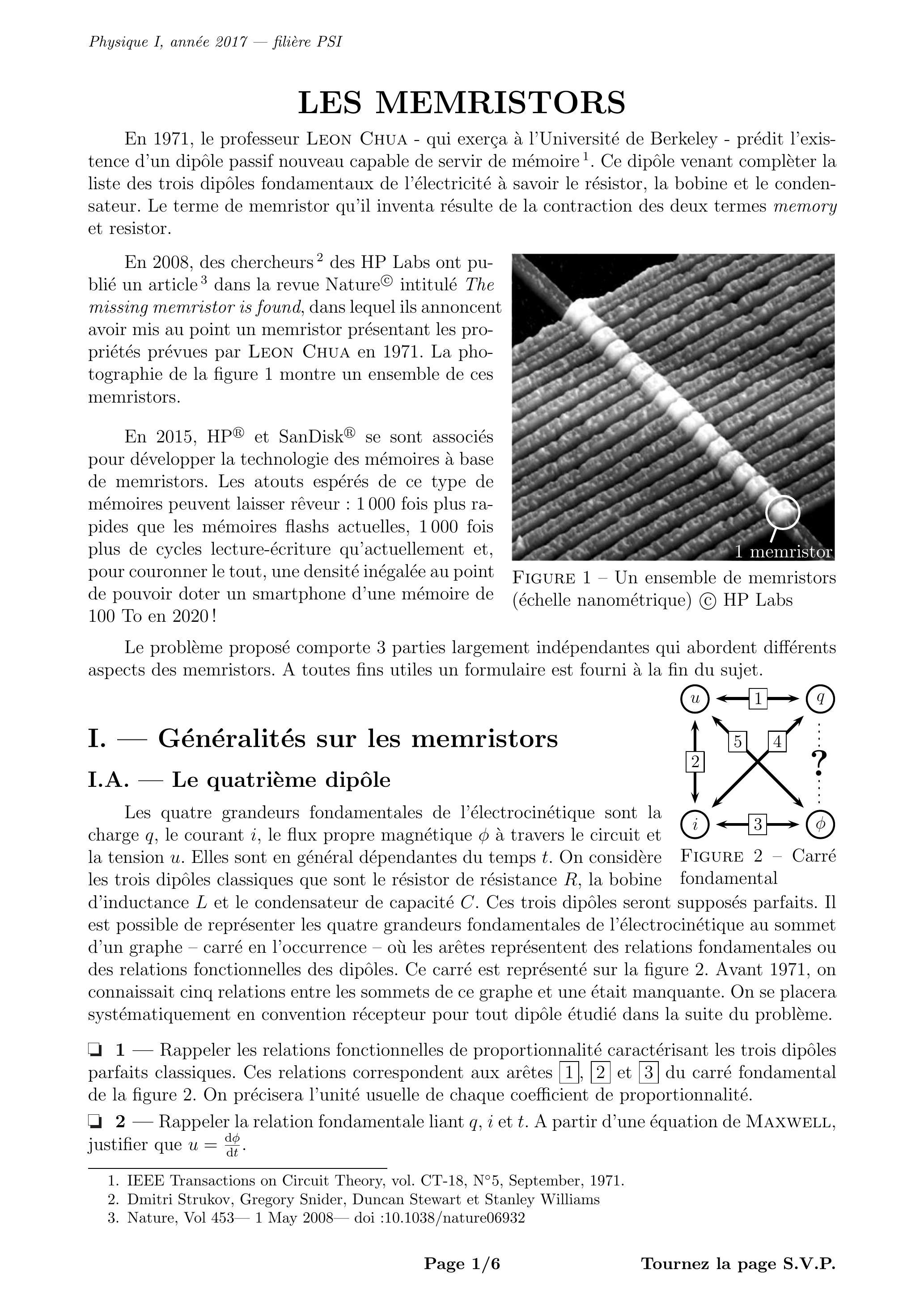 Le problème proposé comporte 3 parties largement indépendantes qui abordent différents aspects des memristors. A toutes fins utiles un formulaire est fourni à la fin du sujet.