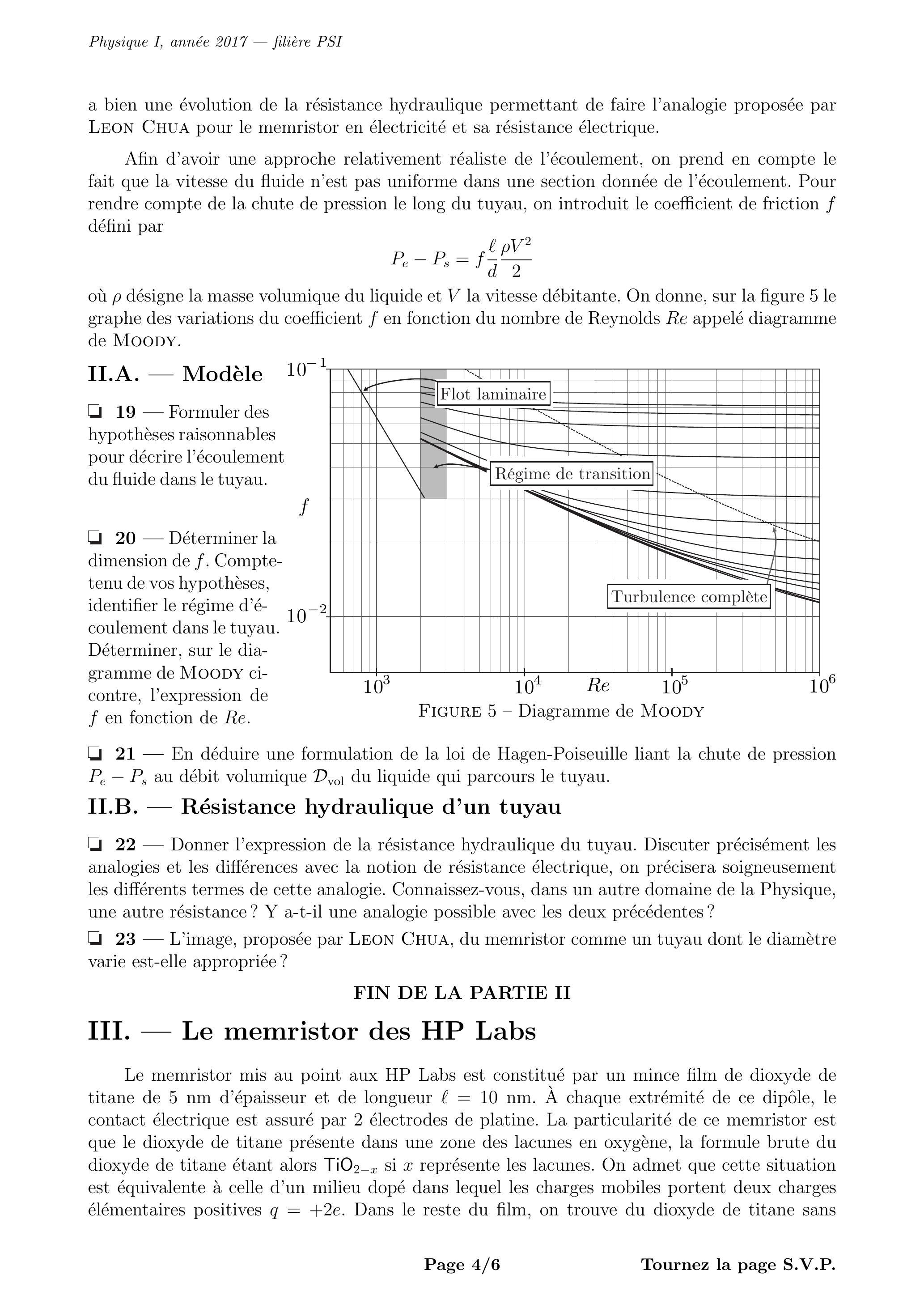 20 - Déterminer la dimension de . Comptetenu de vos hypothèses, identifier le régime d'écoulement dans le tuyau. Déterminer, sur le diagramme de Moody cicontre, l'expression de en fonction de Re.