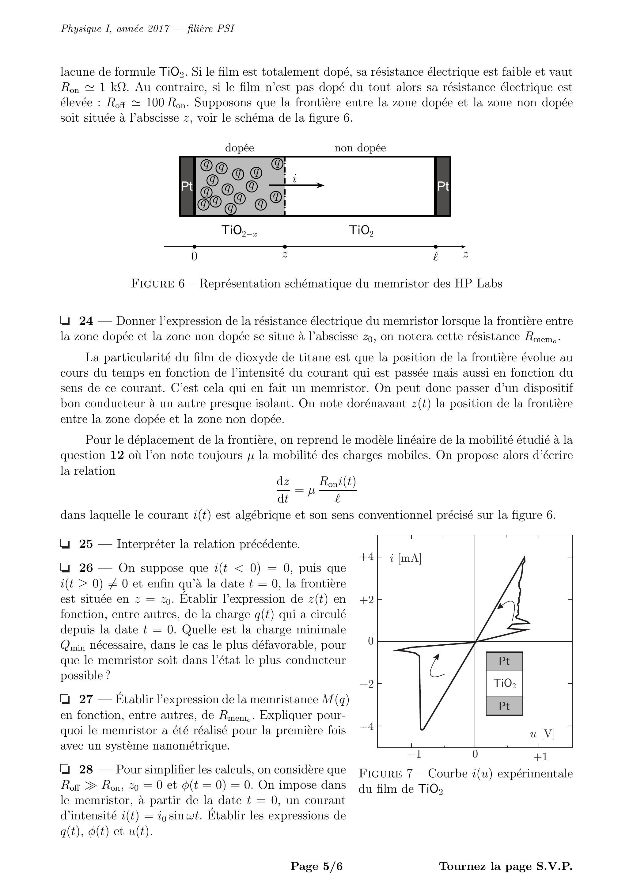 27 - Établir l'expression de la memristance en fonction, entre autres, de . Expliquer pourquoi le memristor a été réalisé pour la première fois avec un système nanométrique. - Pour simplifier les calculs, on considère que et . On impose dans le memristor, à partir de la date , un courant d'intensité . Établir les expressions de