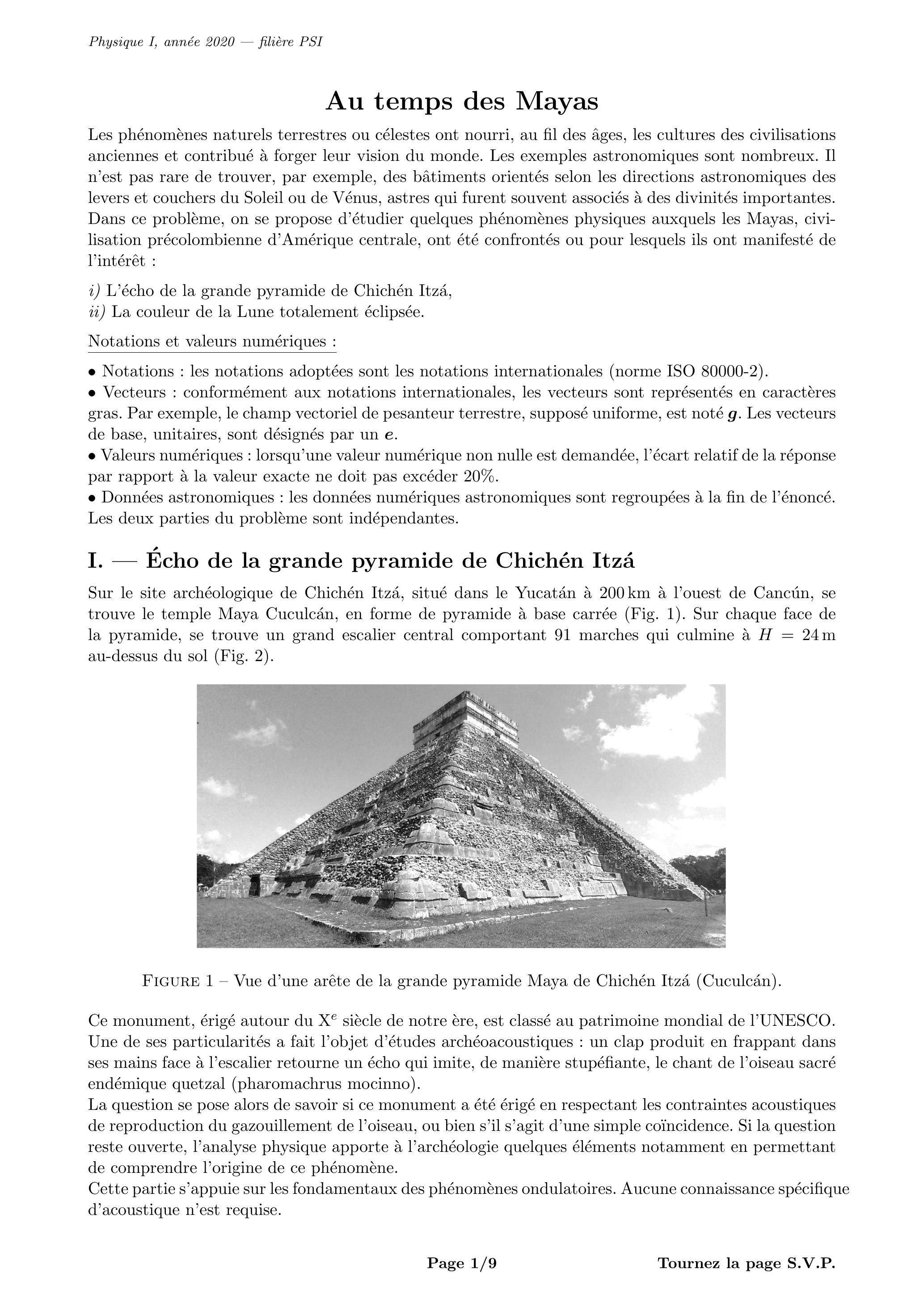 Les phénomènes naturels terrestres ou célestes ont nourri, au fil des âges, les cultures des civilisations anciennes et contribué à forger leur vision du monde. Les exemples astronomiques sont nombreux. Il n'est pas rare de trouver, par exemple, des bâtiments orientés selon les directions astronomiques des levers et couchers du Soleil ou de Vénus, astres qui furent souvent associés à des divinités importantes. Dans ce problème, on se propose d'étudier quelques phénomènes physiques auxquels les Mayas, civilisation précolombienne d'Amérique centrale, ont été confrontés ou pour lesquels ils ont manifesté de l'intérêt :
