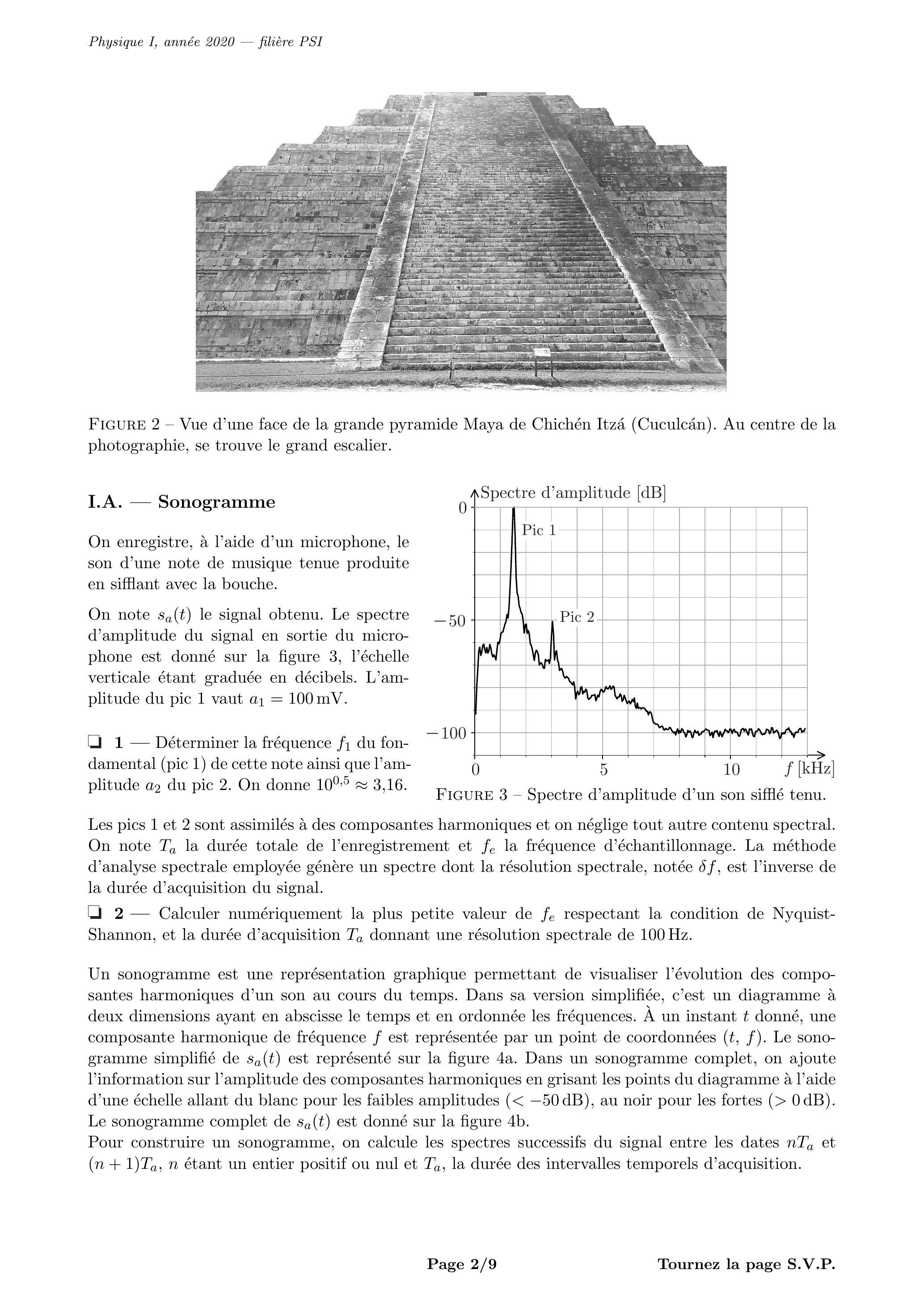 Les pics 1 et 2 sont assimilés à des composantes harmoniques et on néglige tout autre contenu spectral. On note la durée totale de l'enregistrement et la fréquence d'échantillonnage. La méthode d'analyse spectrale employée génère un spectre dont la résolution spectrale, notée , est l'inverse de la durée d'acquisition du signal. - Calculer numériquement la plus petite valeur de respectant la condition de NyquistShannon, et la durée d'acquisition donnant une résolution spectrale de 100 Hz .