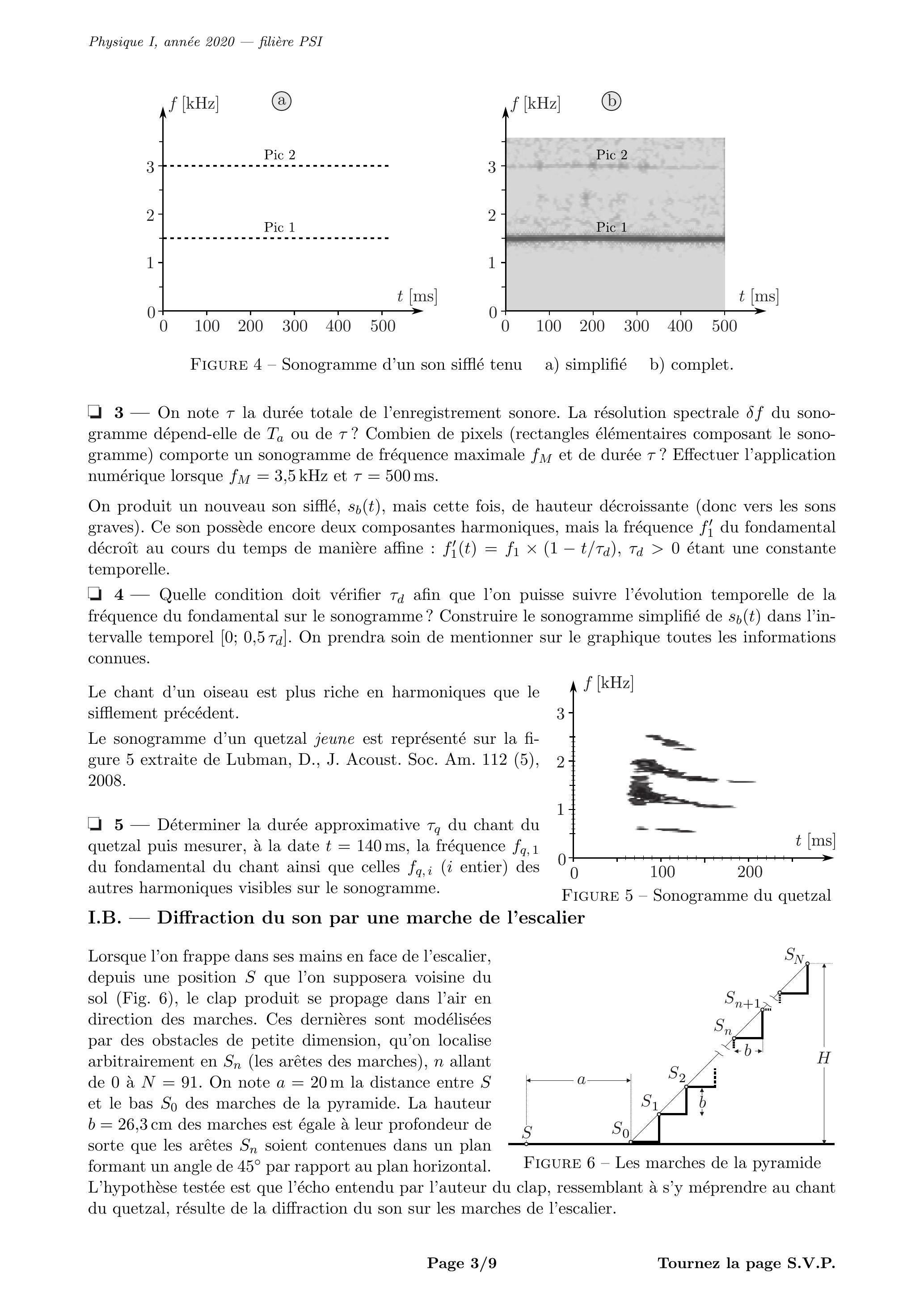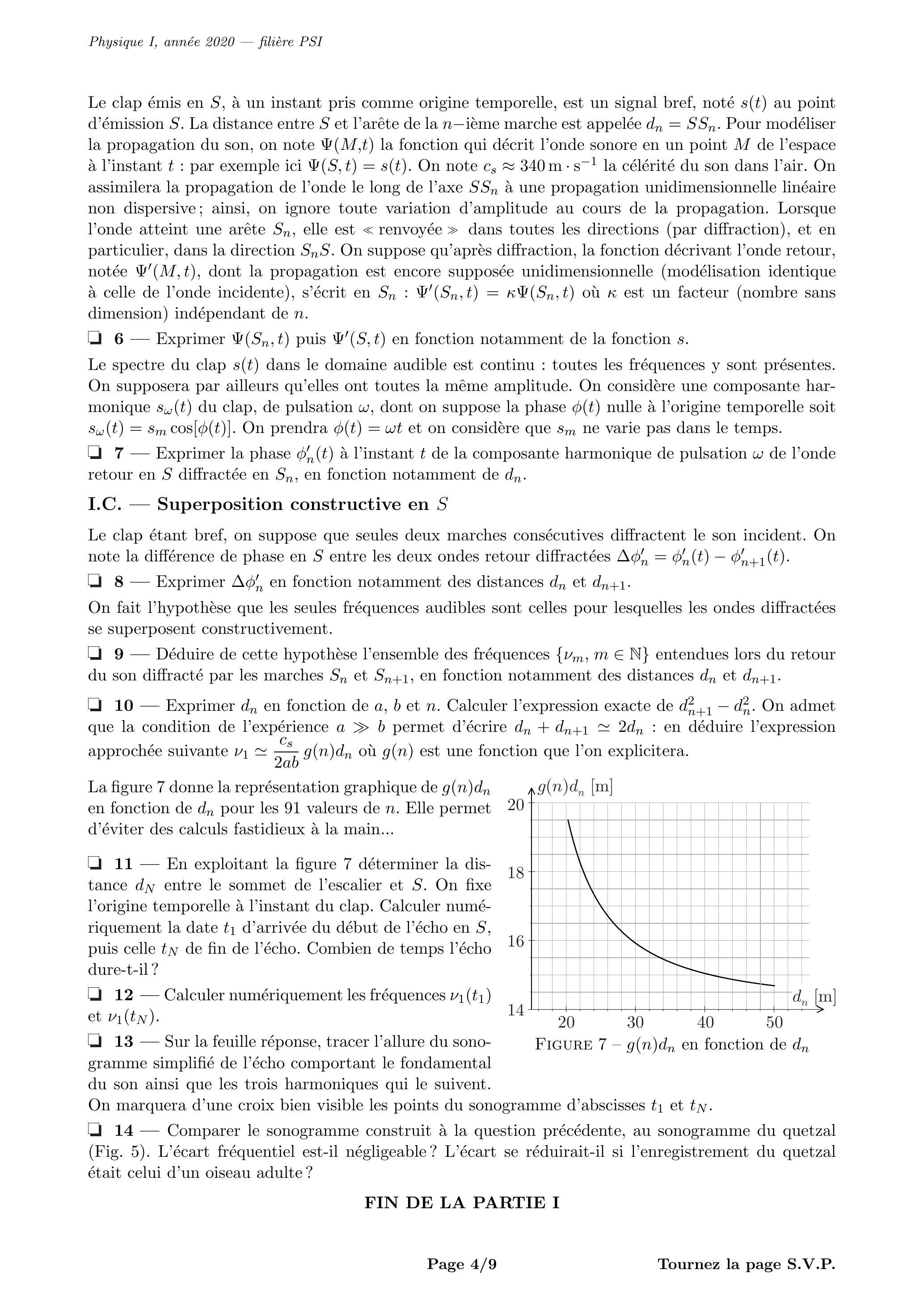 On fait l'hypothèse que les seules fréquences audibles sont celles pour lesquelles les ondes diffractées se superposent constructivement. - Déduire de cette hypothèse l'ensemble des fréquences entendues lors du retour du son diffracté par les marches et , en fonction notamment des distances et . - Exprimer en fonction de et . Calculer l'expression exacte de . On admet que la condition de l'expérience permet d'écrire : en déduire l'expression approchée suivante où est une fonction que l'on explicitera.