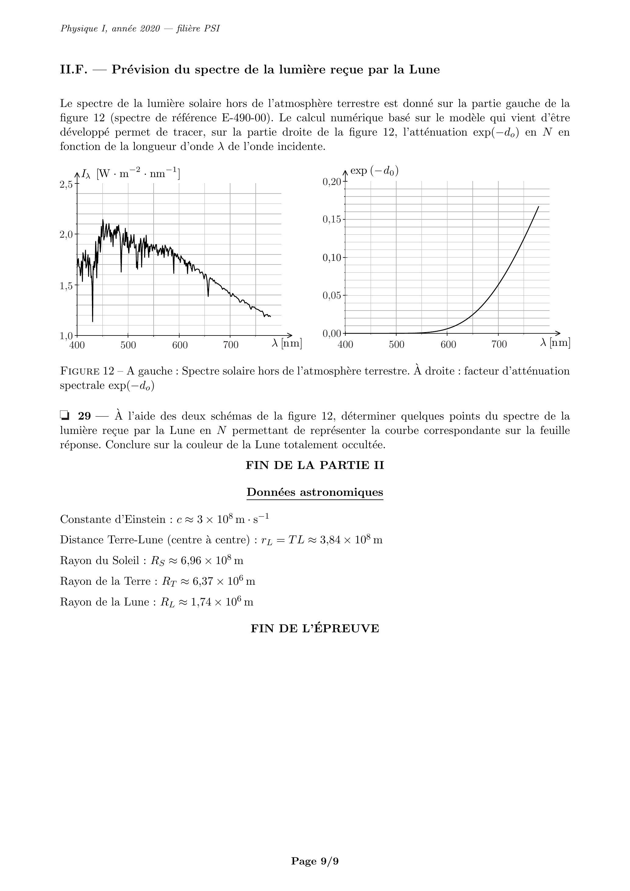 29 - À l'aide des deux schémas de la figure 12, déterminer quelques points du spectre de la lumière reçue par la Lune en permettant de représenter la courbe correspondante sur la feuille réponse. Conclure sur la couleur de la Lune totalement occultée.