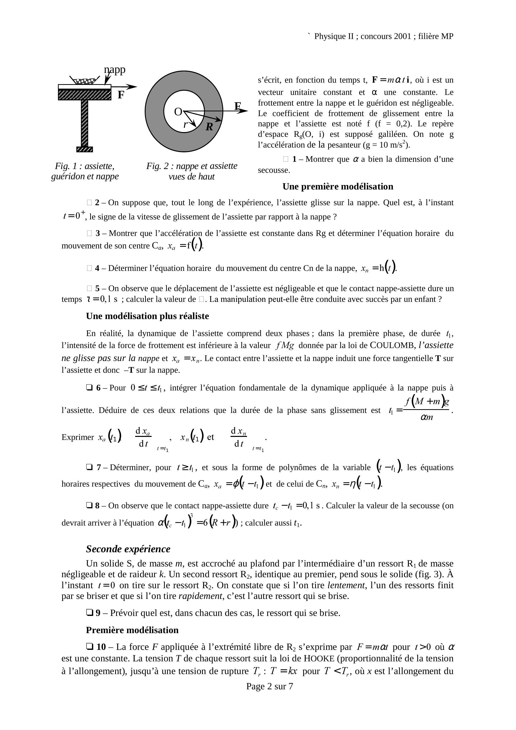 - On suppose que, tout le long de l'expérience, l'assiette glisse sur la nappe. Quel est, à l'instant , le signe de la vitesse de glissement de l'assiette par rapport à la nappe? - Montrer que l'accélération de l'assiette est constante dans Rg et déterminer l'équation horaire du mouvement de son centre . - Déterminer l'équation horaire du mouvement du centre Cn de la nappe, . - On observe que le déplacement de l'assiette est négligeable et que le contact nappe-assiette dure un temps ; calculer la valeur de . La manipulation peut-elle être conduite avec succès par un enfant?
