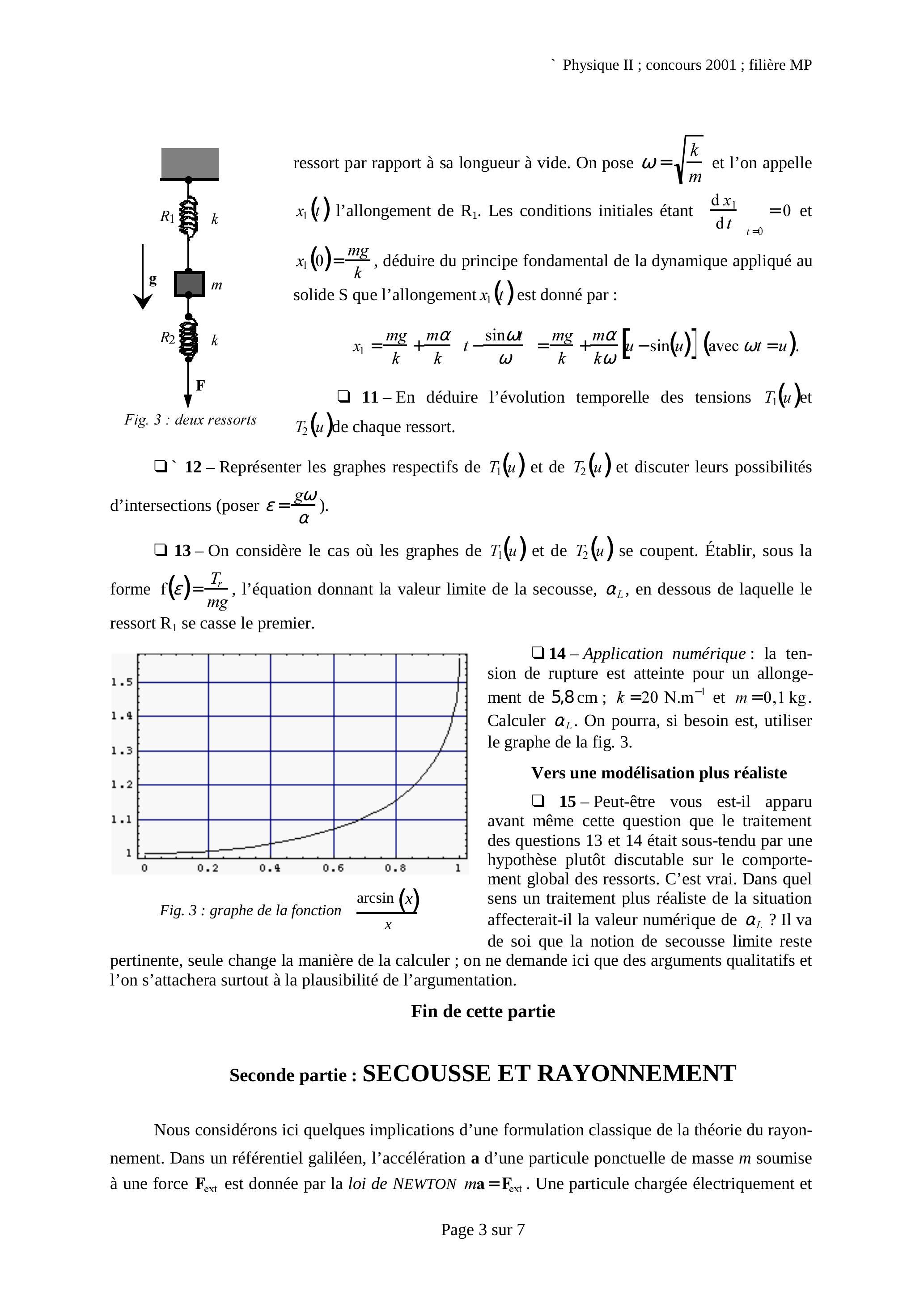 15 - Peut-être vous est-il apparu avant même cette question que le traitement des questions 13 et 14 était sous-tendu par une hypothèse plutôt discutable sur le comportement global des ressorts. C’est vrai. Dans quel sens un traitement plus réaliste de la situation affecterait-il la valeur numérique de ? Il va de soi que la notion de secousse limite reste pertinente, seule change la manière de la calculer ; on ne demande ici que des arguments qualitatifs et l'on s'attachera surtout à la plausibilité de l'argumentation.