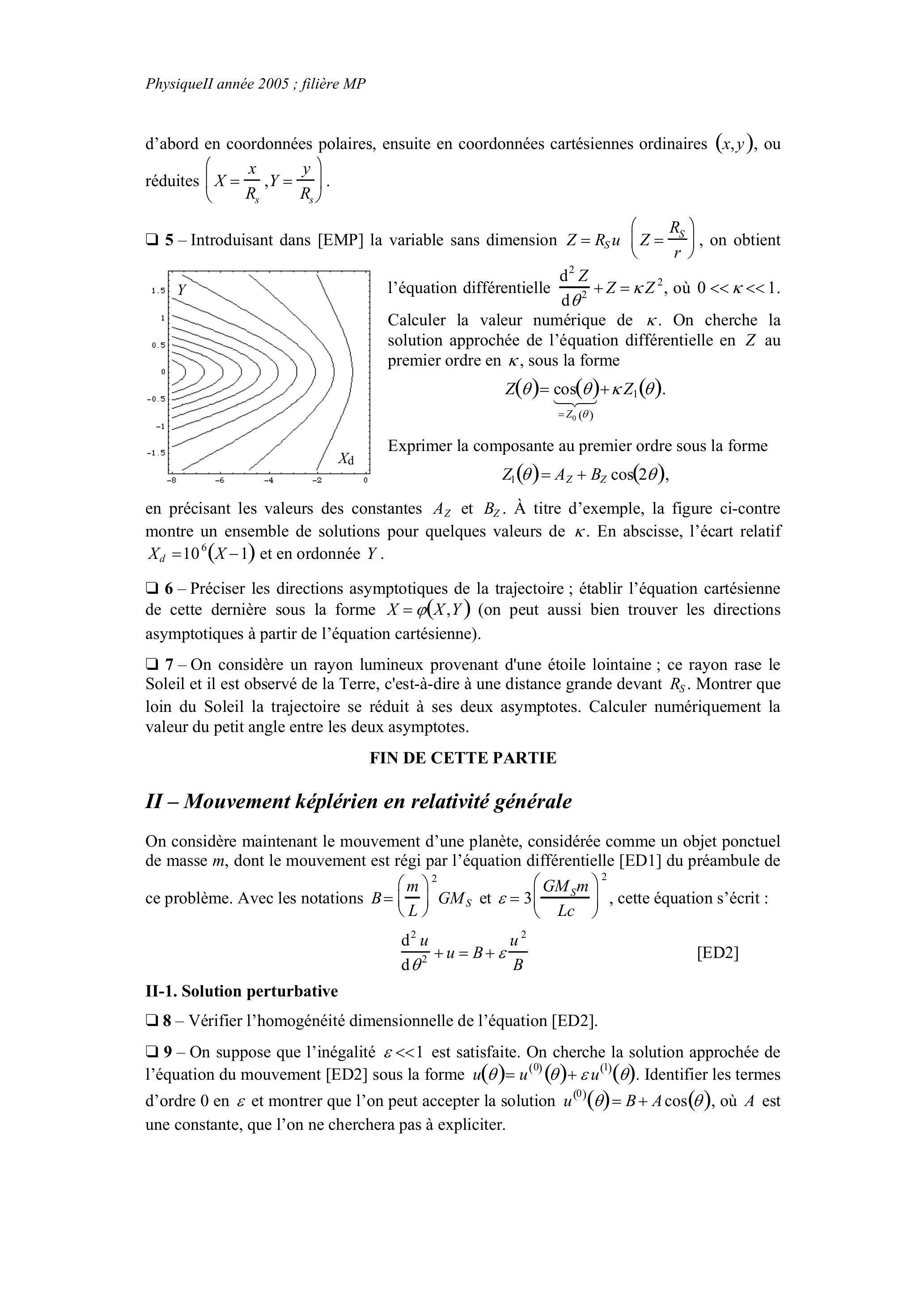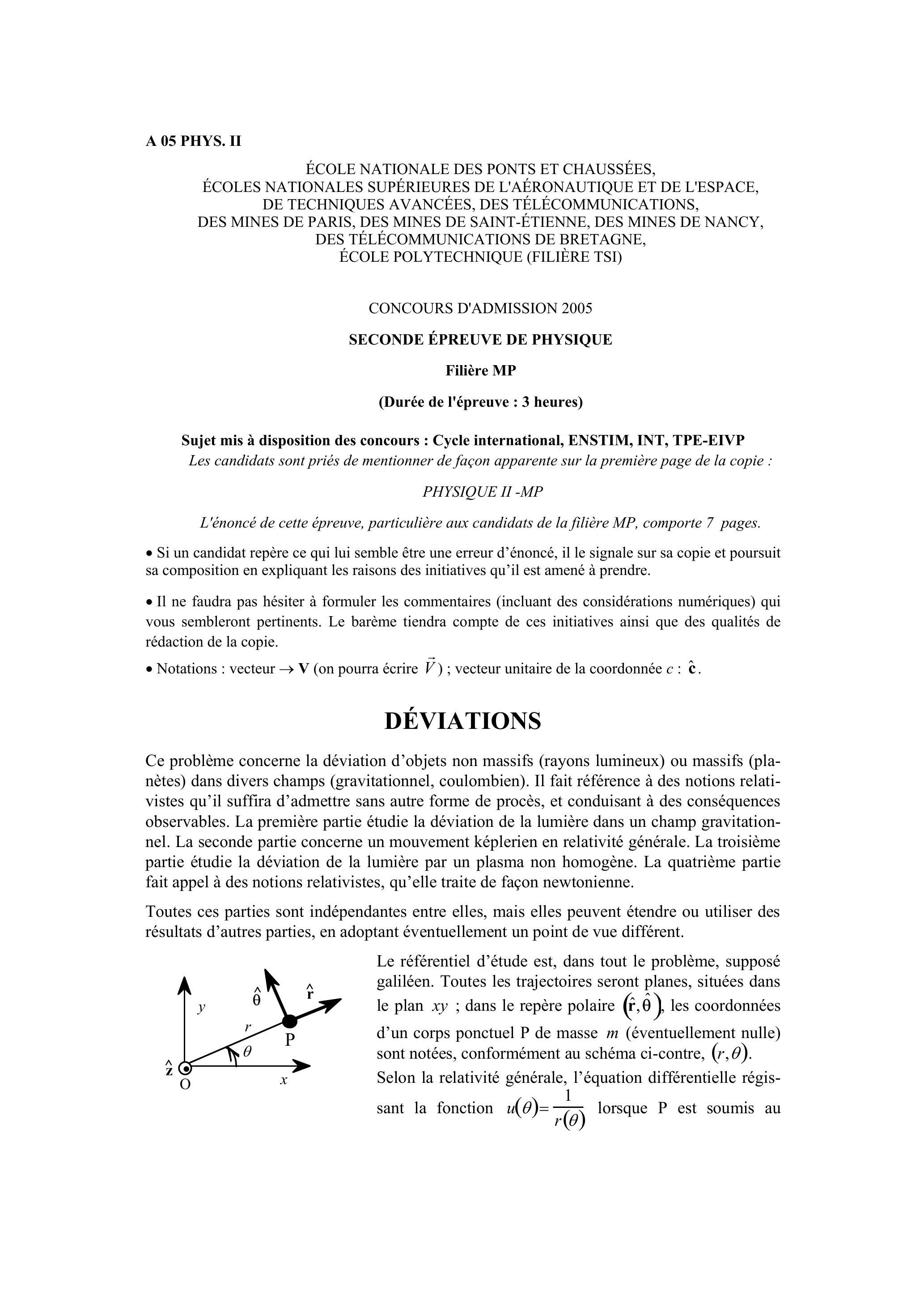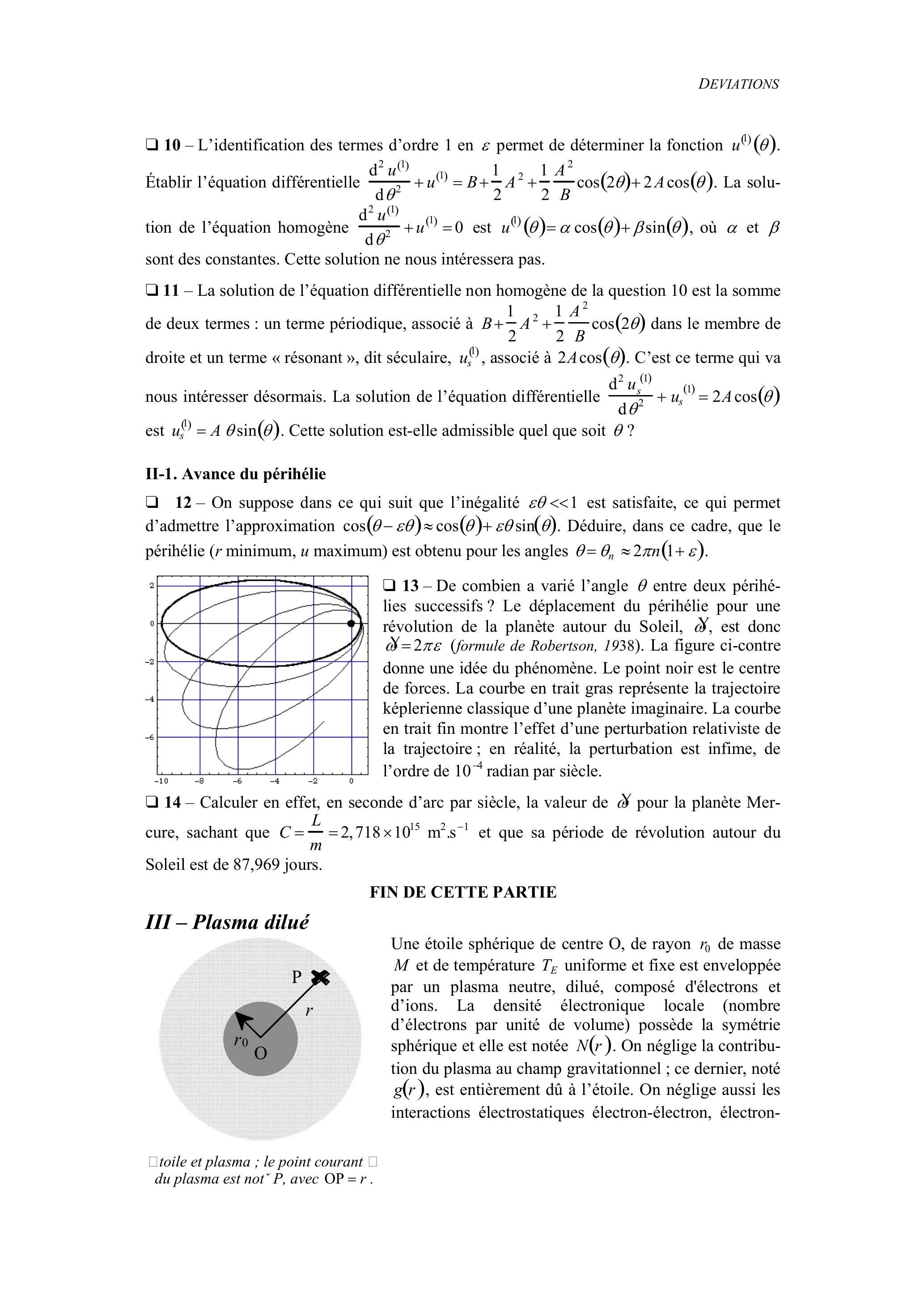 Ce problème concerne la déviation d'objets non massifs (rayons lumineux) ou massifs (planètes) dans divers champs (gravitationnel, coulombien). Il fait référence à des notions relativistes qu'il suffira d'admettre sans autre forme de procès, et conduisant à des conséquences observables. La première partie étudie la déviation de la lumière dans un champ gravitationnel. La seconde partie concerne un mouvement képlerien en relativité générale. La troisième partie étudie la déviation de la lumière par un plasma non homogène. La quatrième partie fait appel à des notions relativistes, qu'elle traite de façon newtonienne.