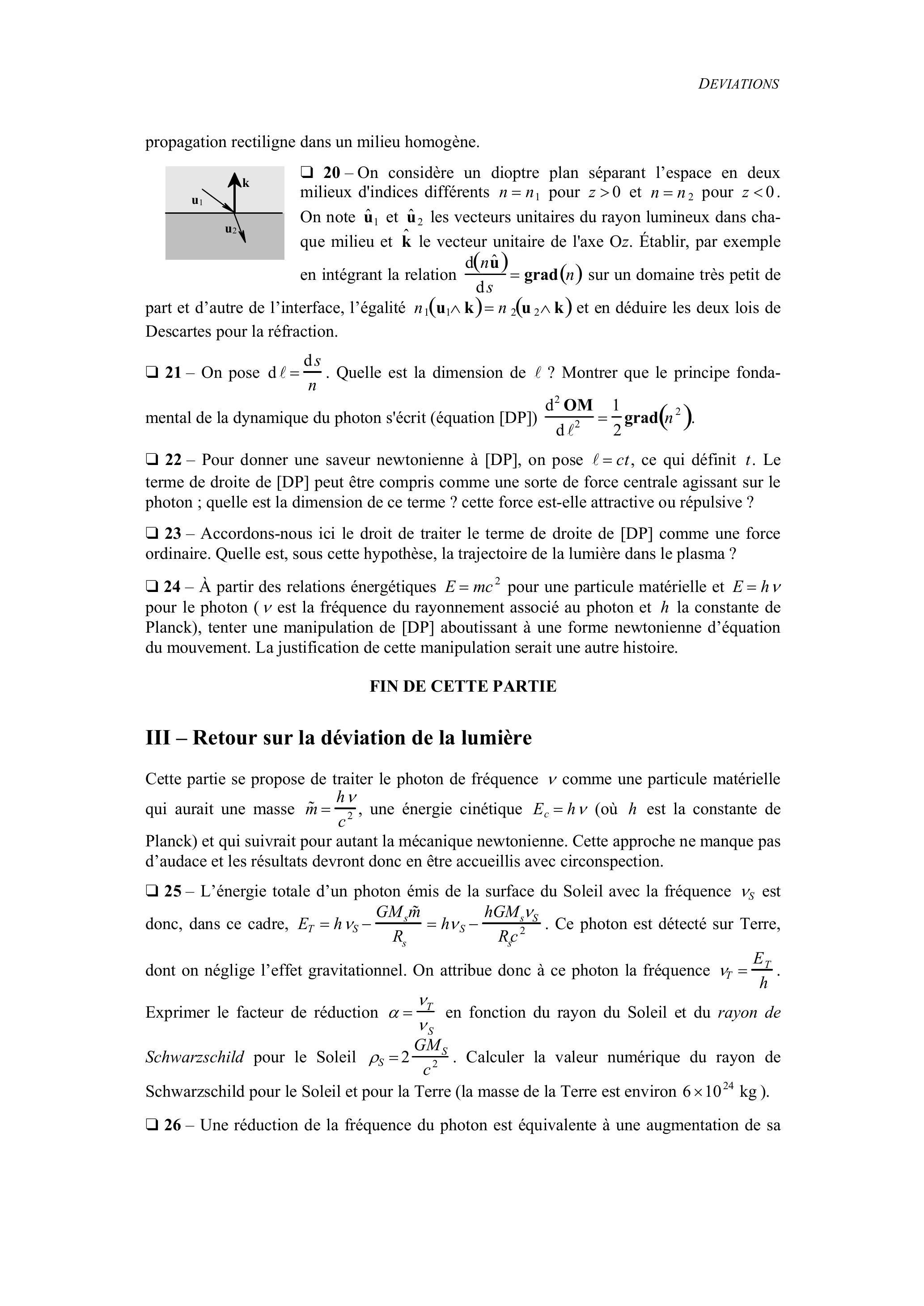 propagation rectiligne dans un milieu homogène. - On considère un dioptre plan séparant l'espace en deux milieux d'indices différents pour et pour . On note et les vecteurs unitaires du rayon lumineux dans chaque milieu et le vecteur unitaire de l'axe . Établir, par exemple en intégrant la relation sur un domaine très petit de part et d'autre de l'interface, l'égalité et en déduire les deux lois de Descartes pour la réfraction. - On pose . Quelle est la dimension de ? Montrer que le principe fondamental de la dynamique du photon s'écrit (équation .