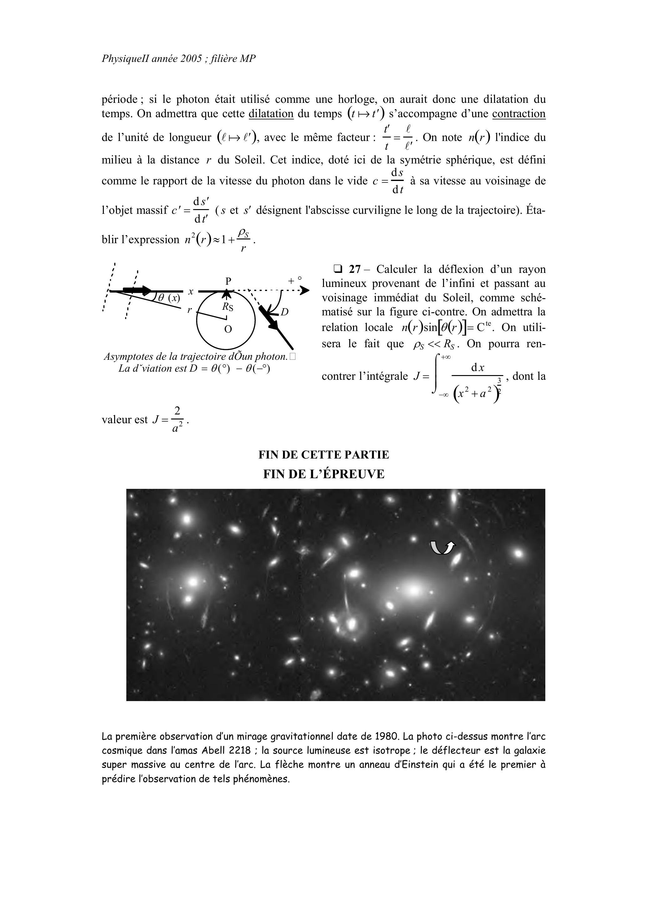 période; si le photon était utilisé comme une horloge, on aurait donc une dilatation du temps. On admettra que cette dilatation du temps ( ) s'accompagne d'une contraction de l'unité de longueur , avec le même facteur: . On note l'indice du milieu à la distance du Soleil. Cet indice, doté ici de la symétrie sphérique, est défini comme le rapport de la vitesse du photon dans le vide à sa vitesse au voisinage de l'objet massif ( et désignent l'abscisse curviligne le long de la trajectoire). Établir l'expression .