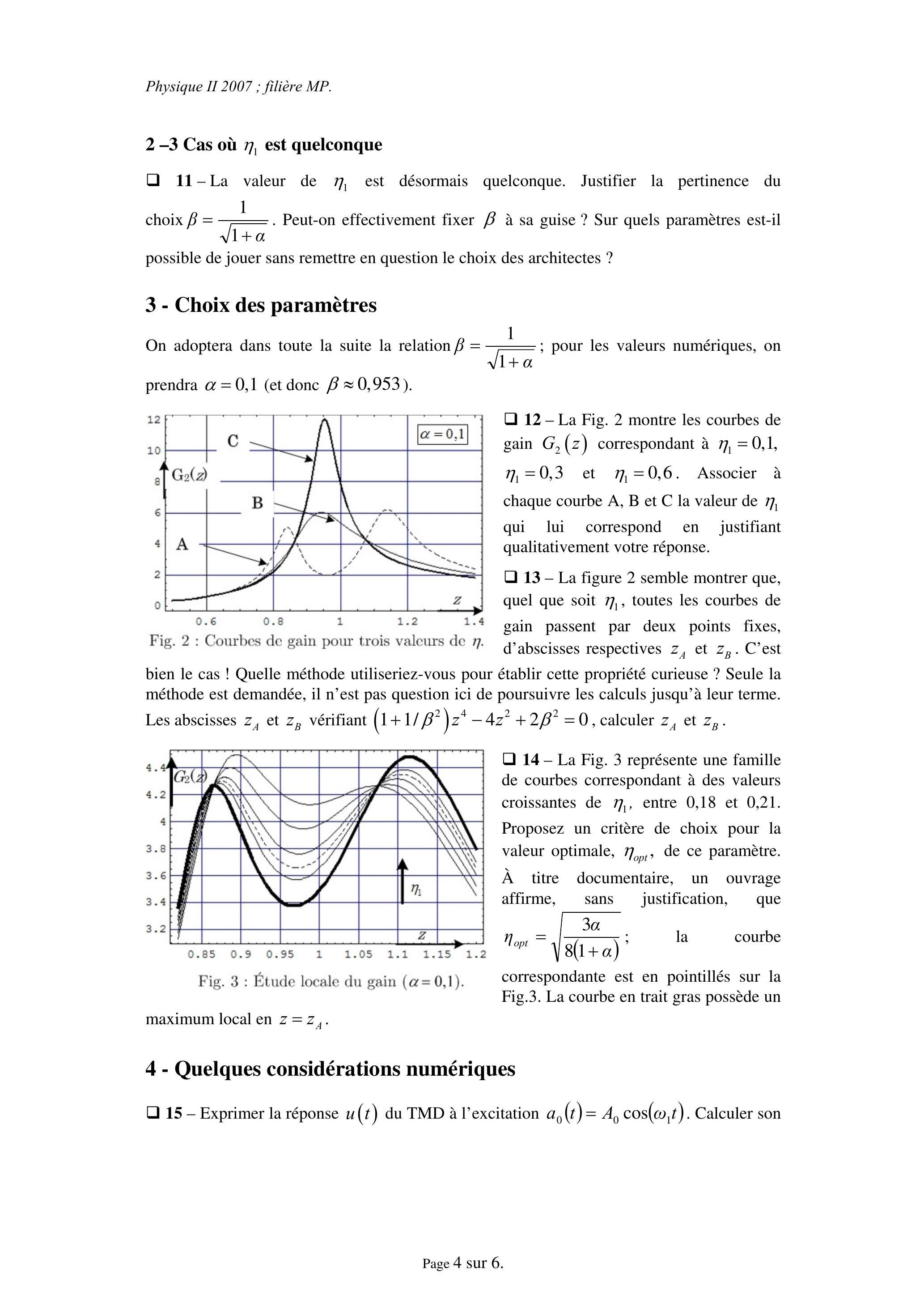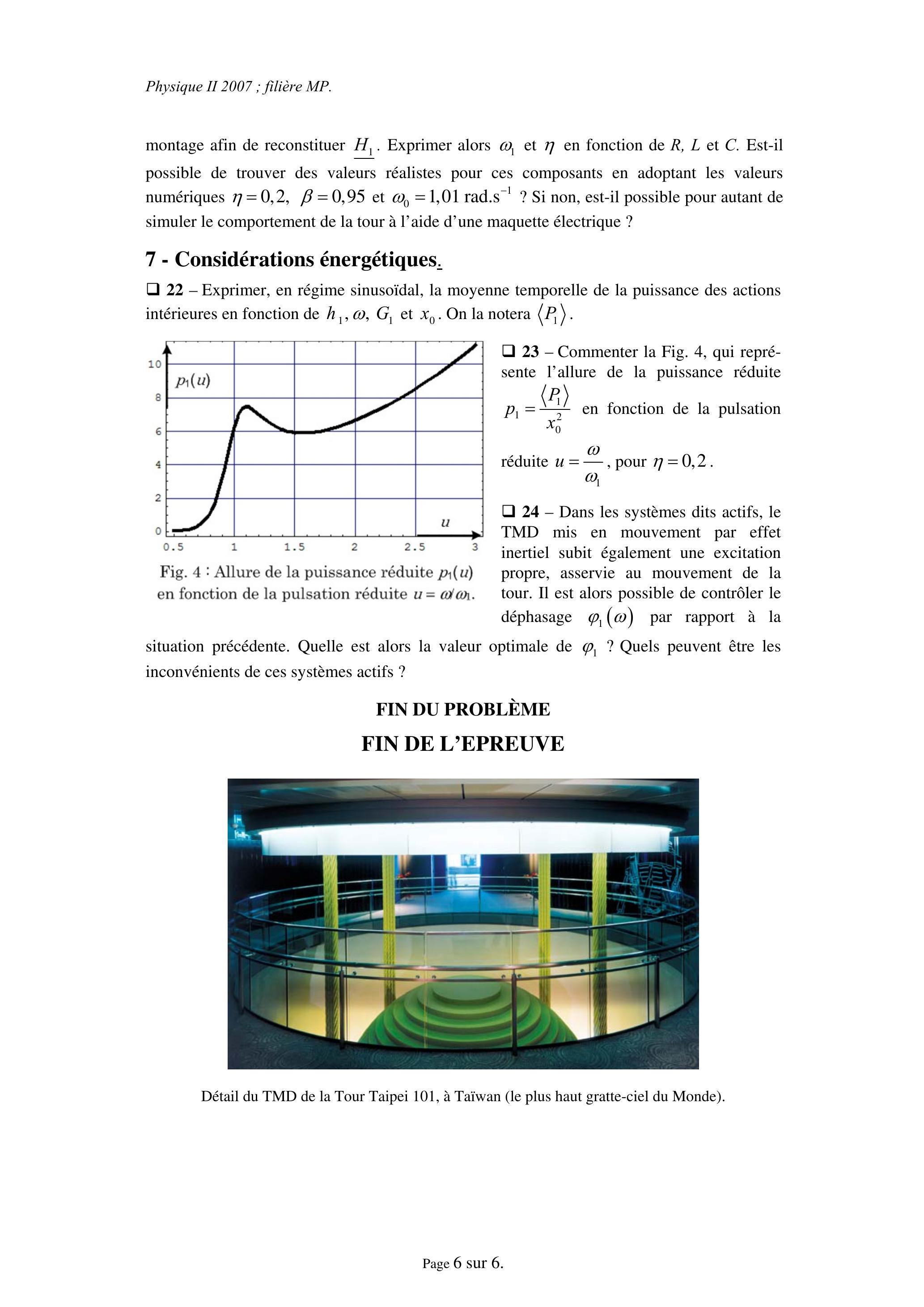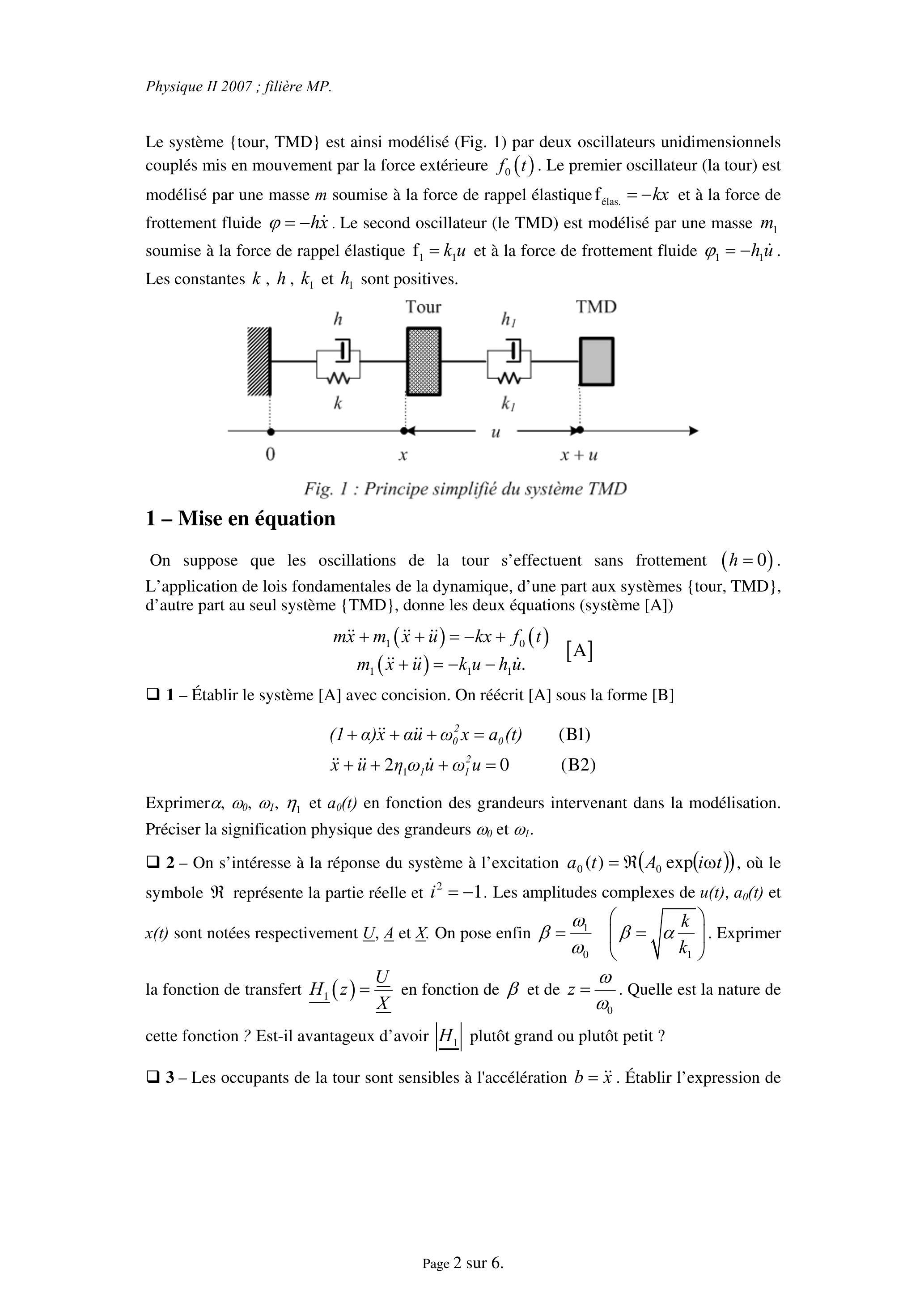 La minimisation des oscillations provoquées par le vent est une difficulté à laquelle sont confrontés les concepteurs de structures de génie civil (ponts, viaducs, antennes ...). L'objet de ce problème est l'étude d'un dispositif efficace pour cette minimisation, le «Tuned Mass Damper (TMD). C'est un oscillateur accordé et amorti, généralement dissimulé au sommet de la structure, et couplé au mouvement de cette dernière, de telle manière que, idéalement, il oscille en opposition de phase avec elle et «détourne» ainsi de l'énergie. Dans un repère galiléen, le mouvement du sommet S de la tour et celui du TMD s'effectuent selon une direction horizontale fixe. On note l'élongation linéaire de S et celle du TMD par rapport à la tour. À l'équilibre mécanique, .
