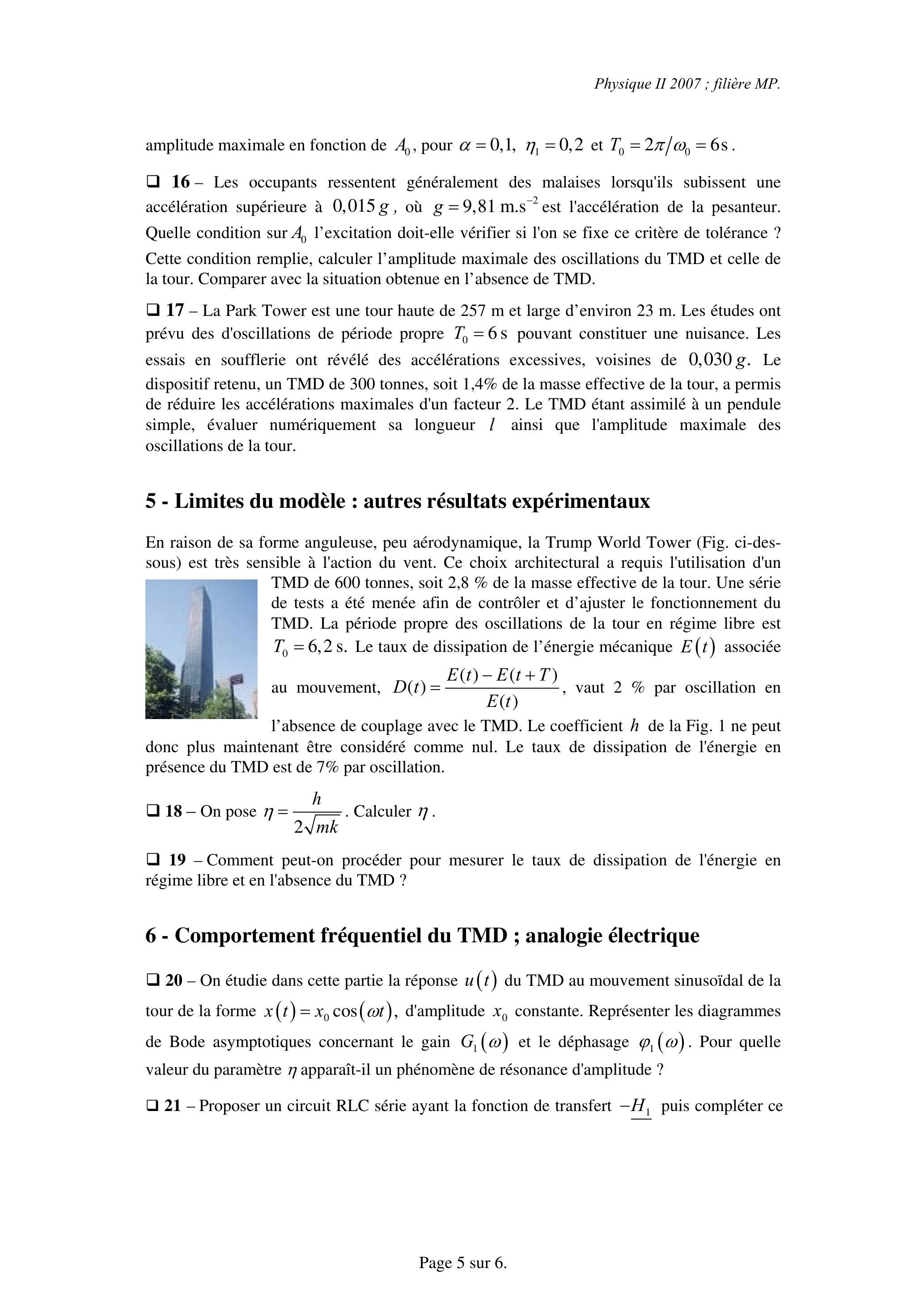 17-La Park Tower est une tour haute de 257 m et large d'environ 23 m . Les études ont prévu des d'oscillations de période propre pouvant constituer une nuisance. Les essais en soufflerie ont révélé des accélérations excessives, voisines de . Le dispositif retenu, un TMD de 300 tonnes, soit de la masse effective de la tour, a permis de réduire les accélérations maximales d'un facteur 2. Le TMD étant assimilé à un pendule simple, évaluer numériquement sa longueur ainsi que l'amplitude maximale des oscillations de la tour.