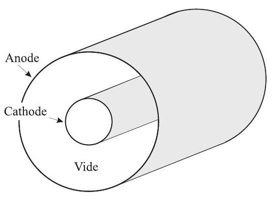 Le schéma de la figure 2 représente la cavité, vide, comprise entre l'électrode interne (cathode), cylindrique de rayon