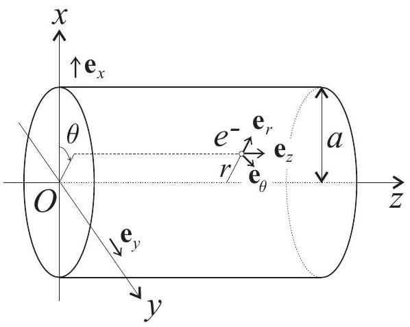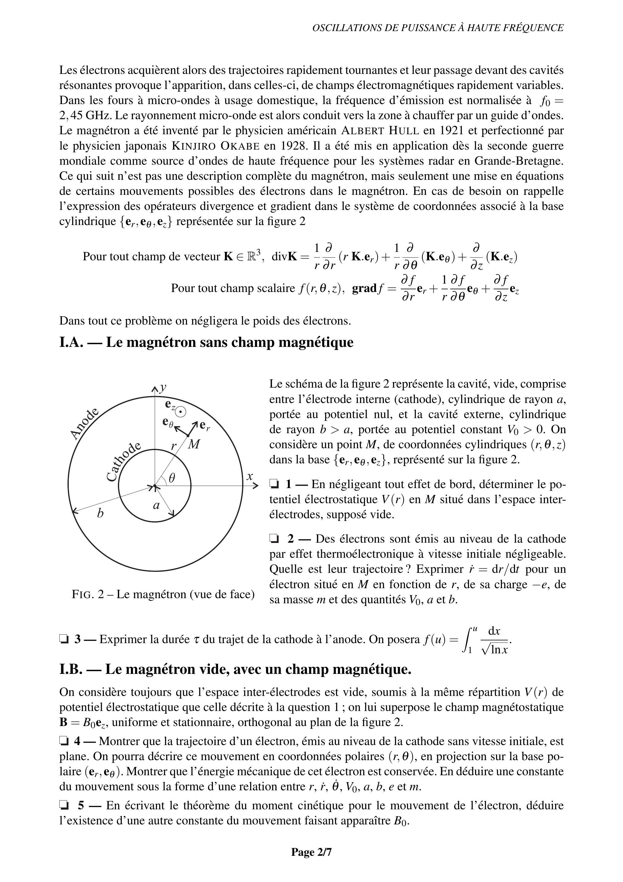 . Le rayonnement micro-onde est alors conduit vers la zone à chauffer par un guide d'ondes. Le magnétron a été inventé par le physicien américain Albert Hull en 1921 et perfectionné par le physicien japonais Kinjiro Okabe en 1928. Il a été mis en application dès la seconde guerre mondiale comme source d'ondes de haute fréquence pour les systèmes radar en Grande-Bretagne. Ce qui suit n'est pas une description complète du magnétron, mais seulement une mise en équations de certains mouvements possibles des électrons dans le magnétron. En cas de besoin on rappelle l'expression des opérateurs divergence et gradient dans le système de coordonnées associé à la base cylindrique