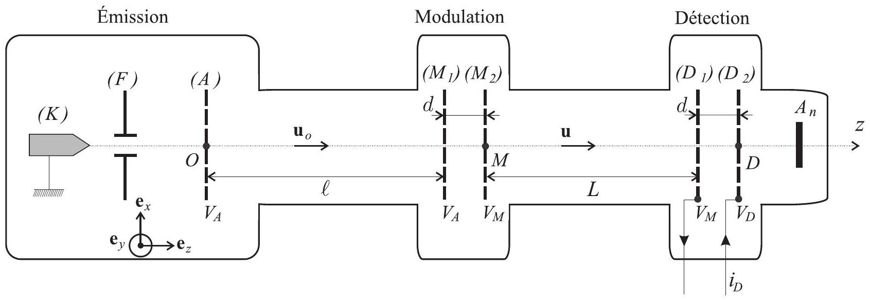 supposées non relativistes dans tout le problème) utilisé en modulation de vitesse, décrit sur la figure 3 . Les électrons sont émis dans le vide qui règne dans la cavité par effet thermoélectronique dans un canon à électrons formé
