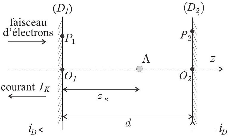 - On considère que la durée du trajet d'un électron entre et est nulle. L'intensité du courant électrique qui atteint la grille de modulation ( ) à l'instant est donc . On note l'intensité du courant électrique qui atteint la grille de détection ( ) à l'instant . Relier et . En déduire que