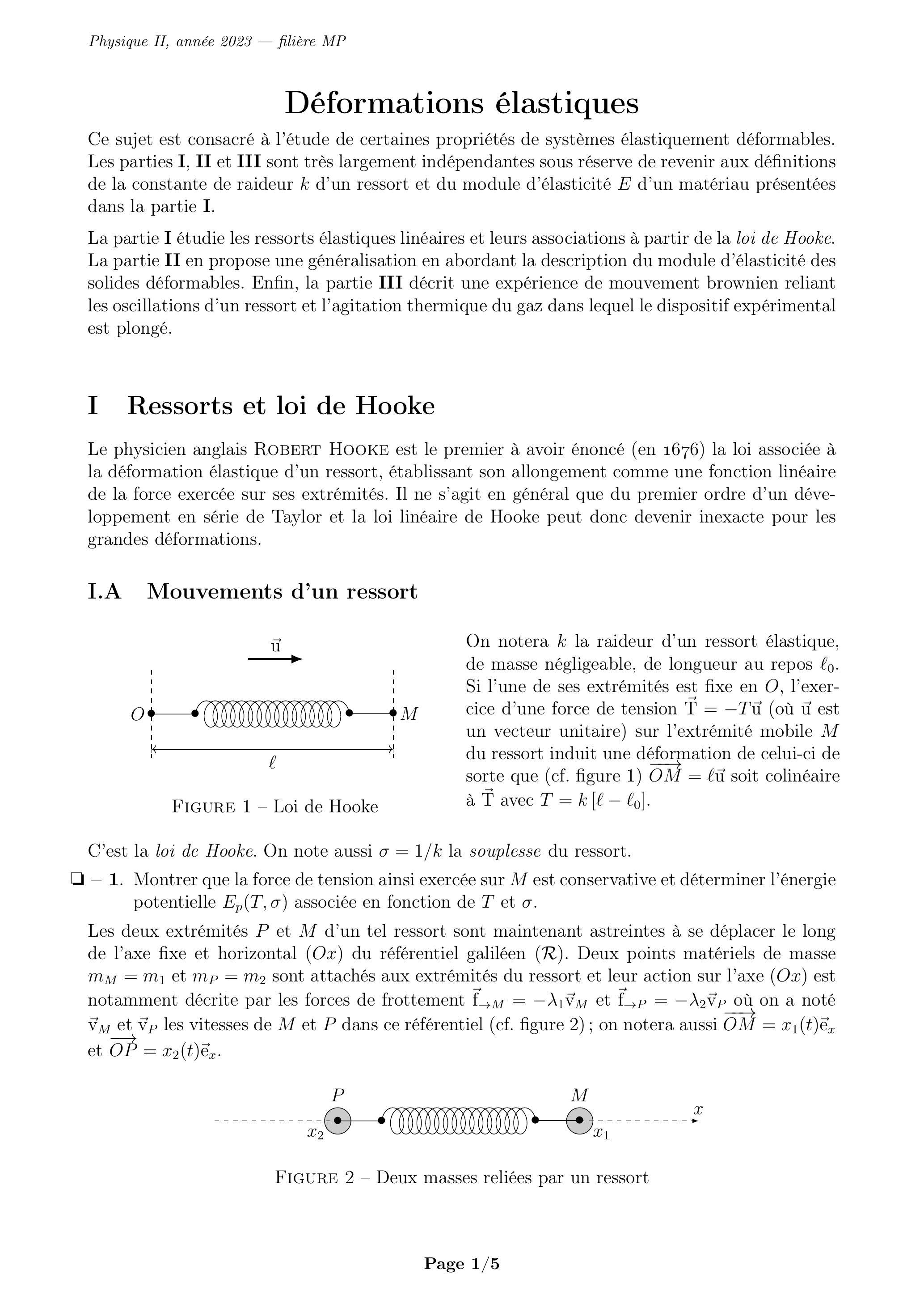 La partie I étudie les ressorts élastiques linéaires et leurs associations à partir de la loi de Hooke. La partie II en propose une généralisation en abordant la description du module d'élasticité des solides déformables. Enfin, la partie III décrit une expérience de mouvement brownien reliant les oscillations d'un ressort et l'agitation thermique du gaz dans lequel le dispositif expérimental est plongé.