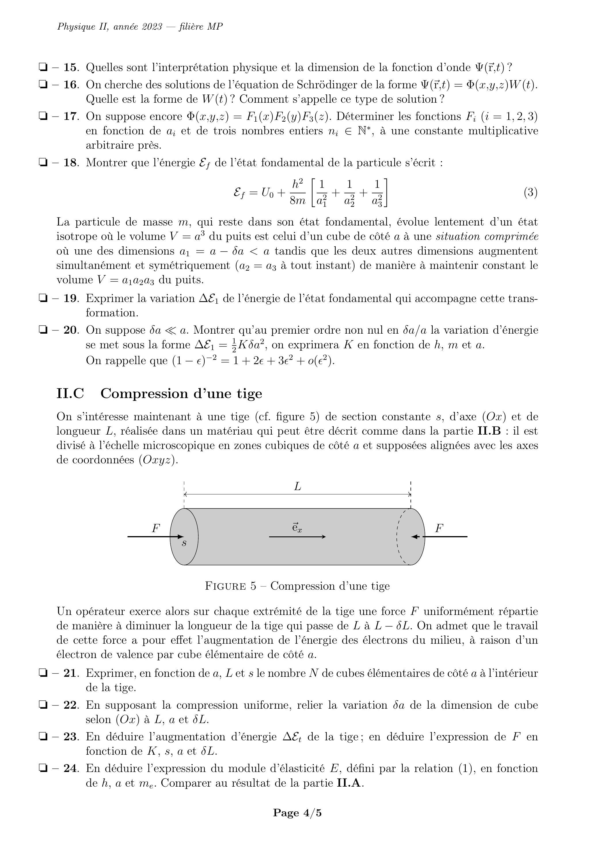 Un opérateur exerce alors sur chaque extrémité de la tige une force uniformément répartie de manière à diminuer la longueur de la tige qui passe de à . On admet que le travail de cette force a pour effet l'augmentation de l'énergie des électrons du milieu, à raison d'un électron de valence par cube élémentaire de côté .