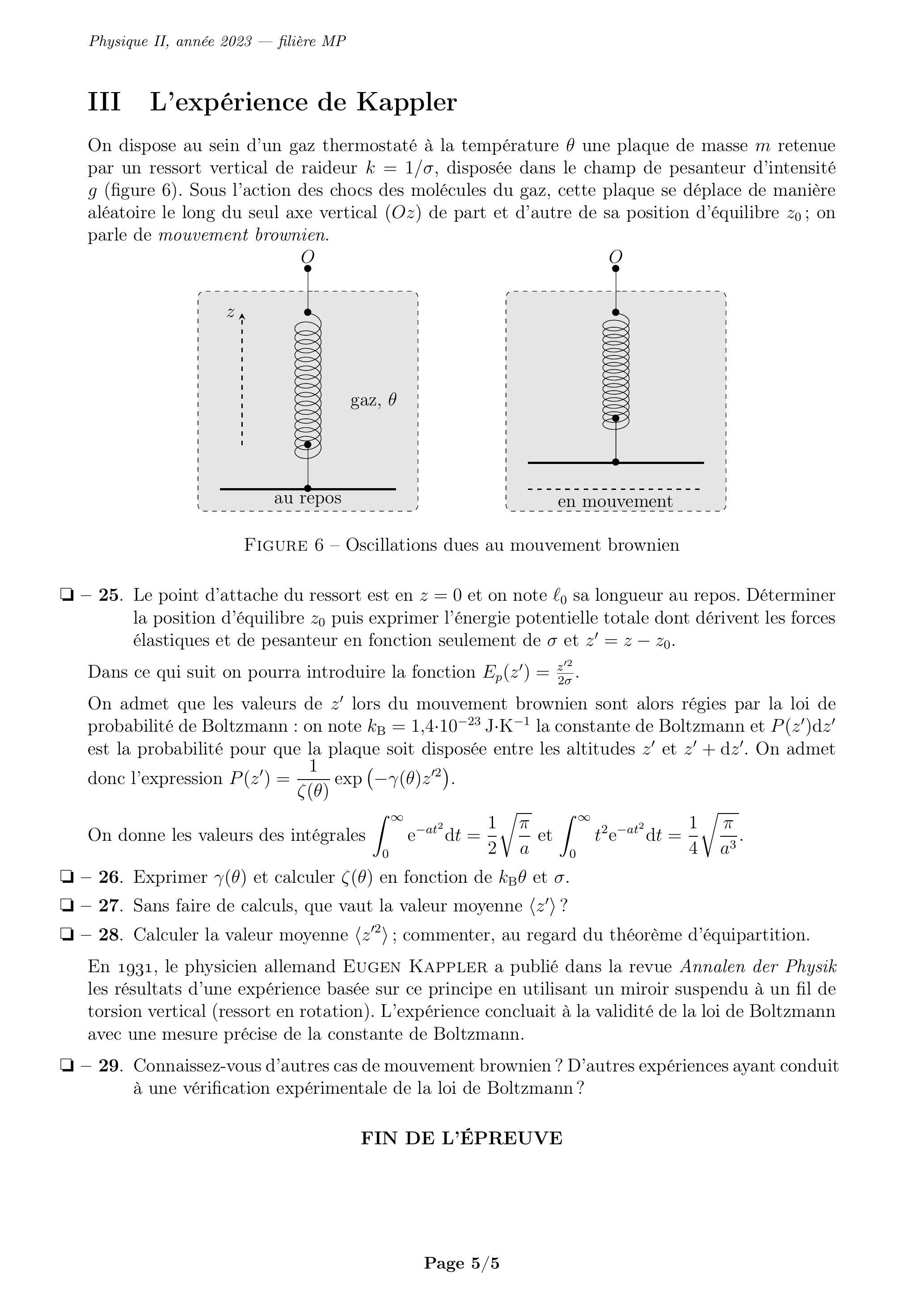 On dispose au sein d'un gaz thermostaté à la température une plaque de masse retenue par un ressort vertical de raideur , disposée dans le champ de pesanteur d'intensité (figure 6). Sous l'action des chocs des molécules du gaz, cette plaque se déplace de manière aléatoire le long du seul axe vertical ( ) de part et d'autre de sa position d'équilibre ; on parle de mouvement brownien.