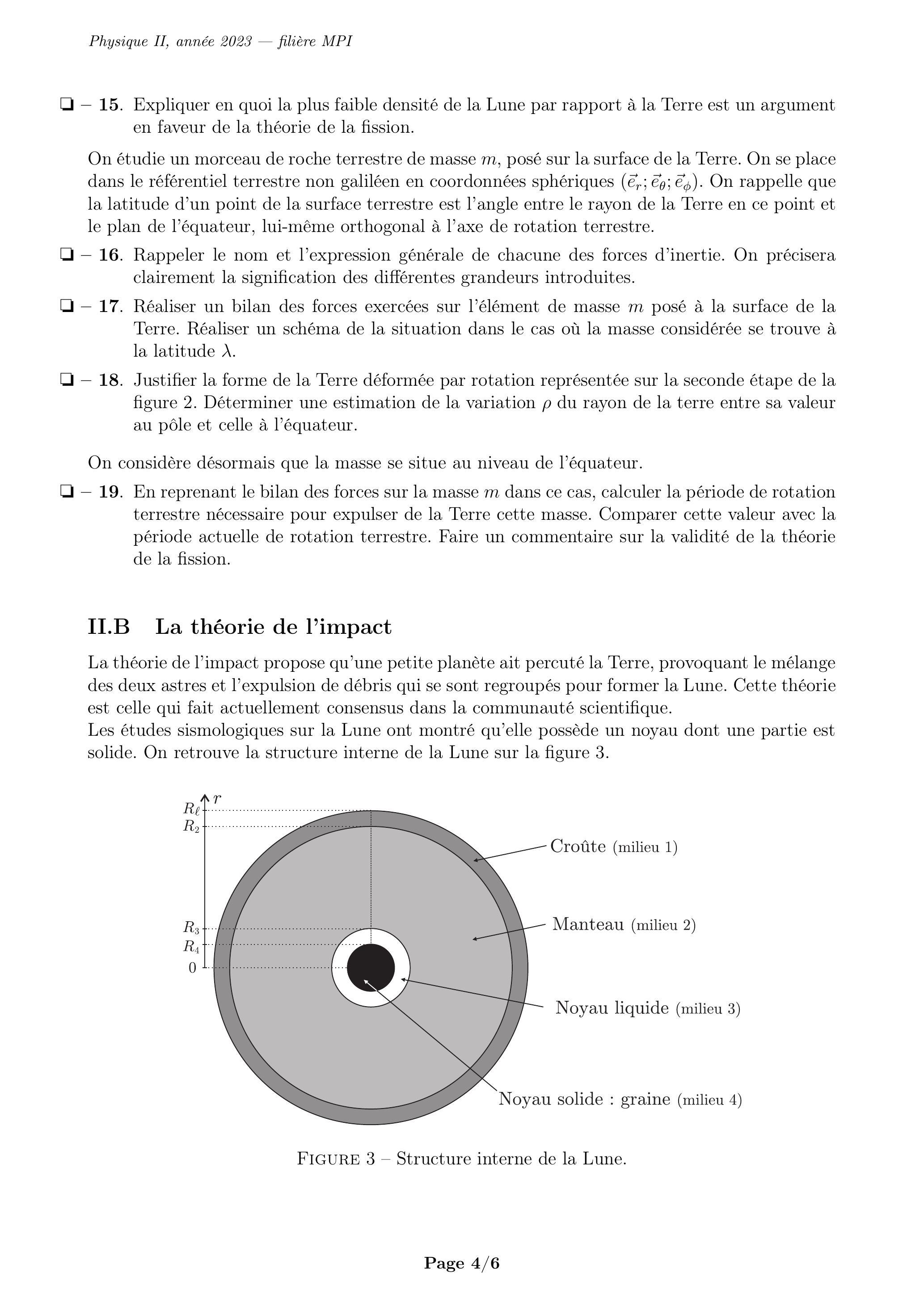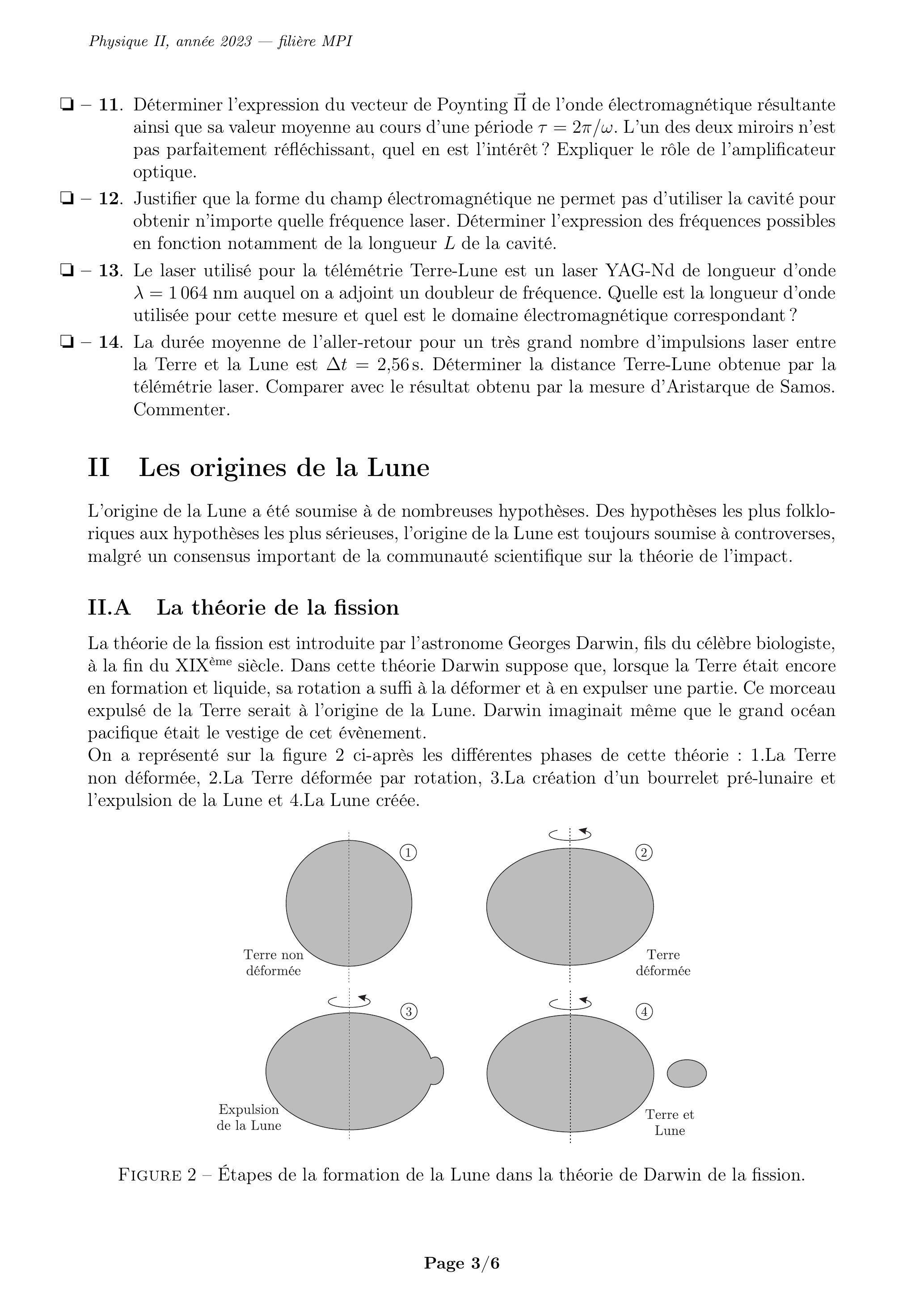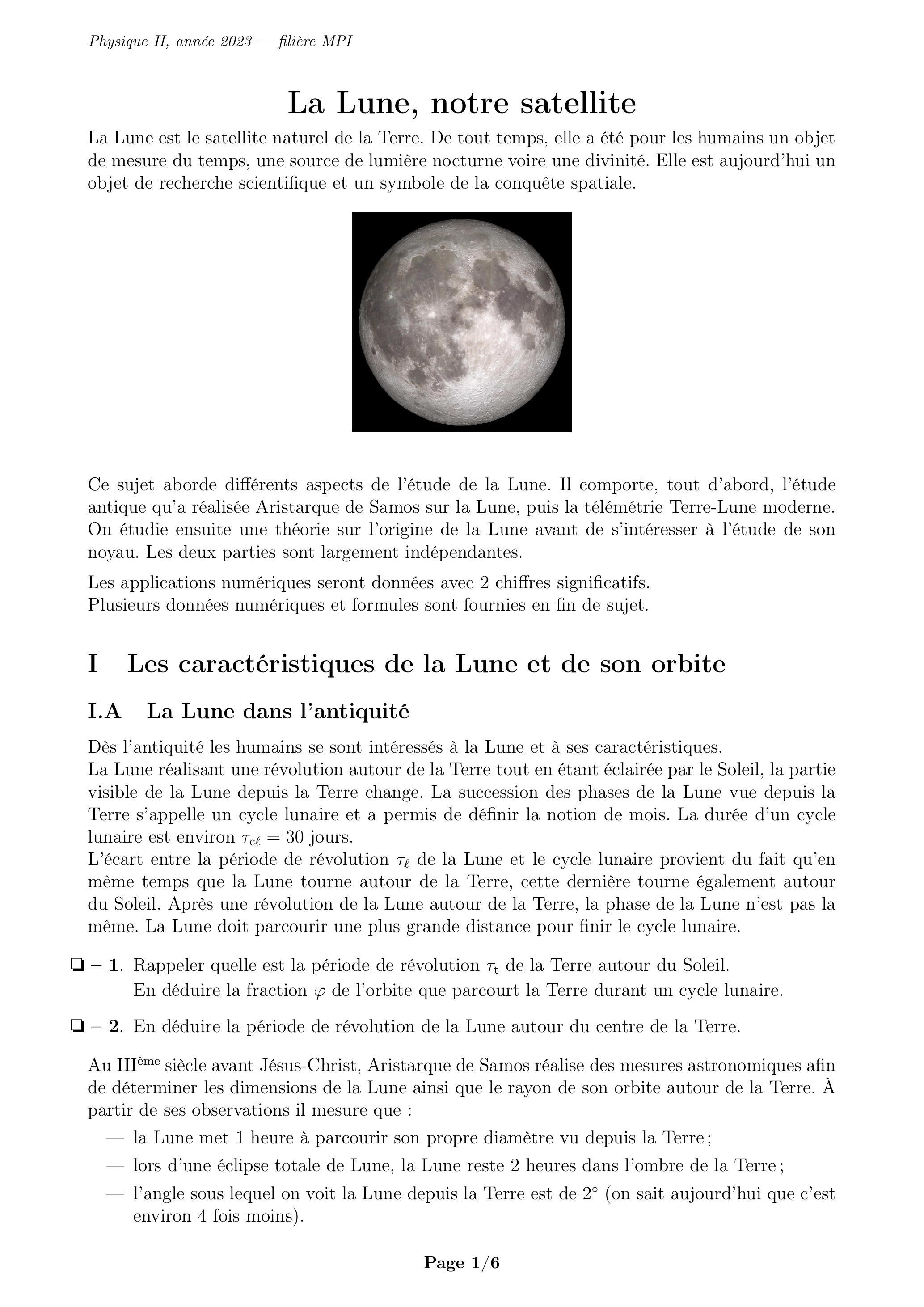Ce sujet aborde différents aspects de l'étude de la Lune. Il comporte, tout d'abord, l'étude antique qu'a réalisée Aristarque de Samos sur la Lune, puis la télémétrie Terre-Lune moderne. On étudie ensuite une théorie sur l'origine de la Lune avant de s'intéresser à l'étude de son noyau. Les deux parties sont largement indépendantes.