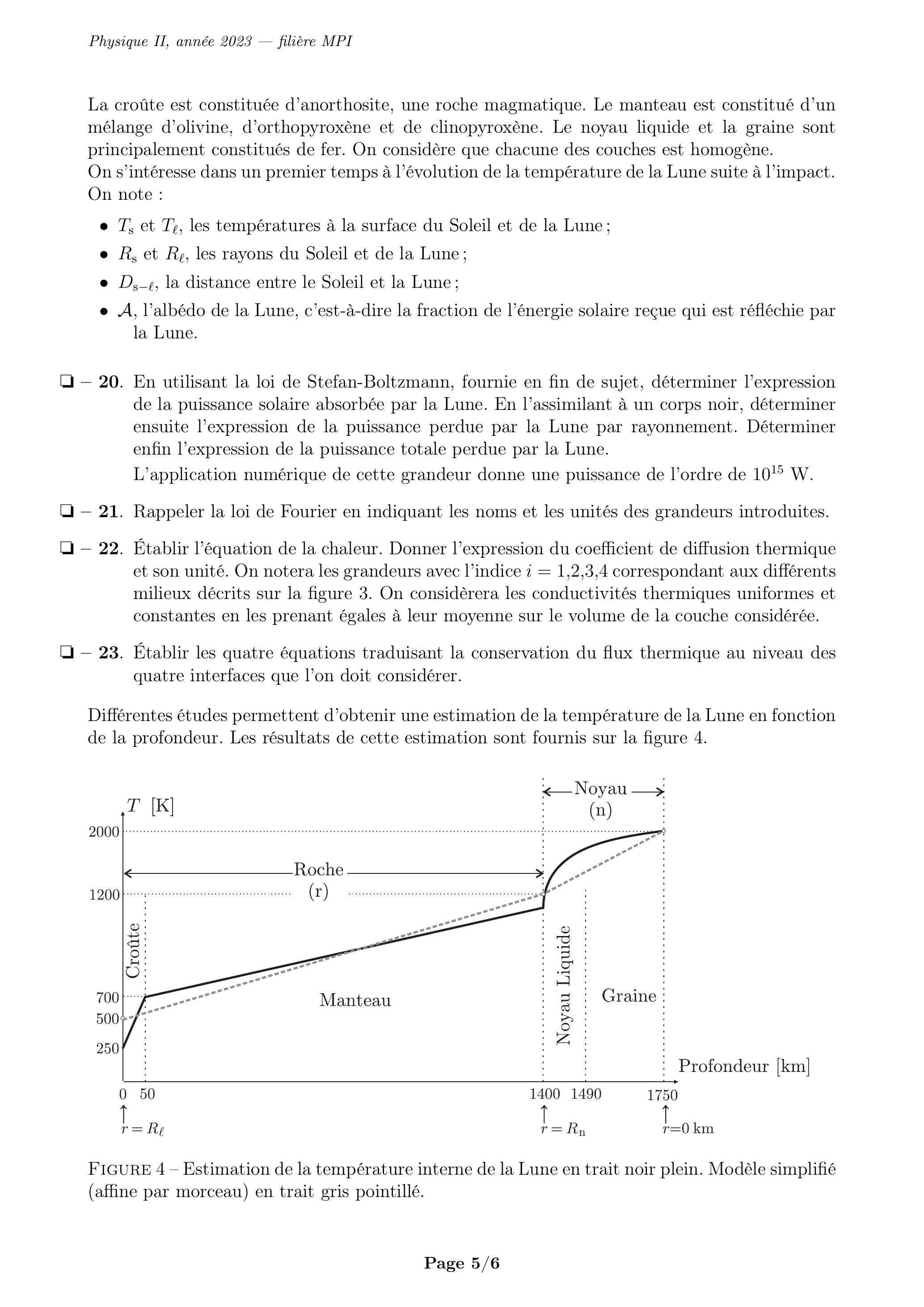 la température de chacune des deux couches est modélisable par une fonction affine de la coordonnée radiale : pour le noyau (n) et pour la roche (r). Ce modèle simplifié est représenté en trait gris pointillé sur la figure 4 ;