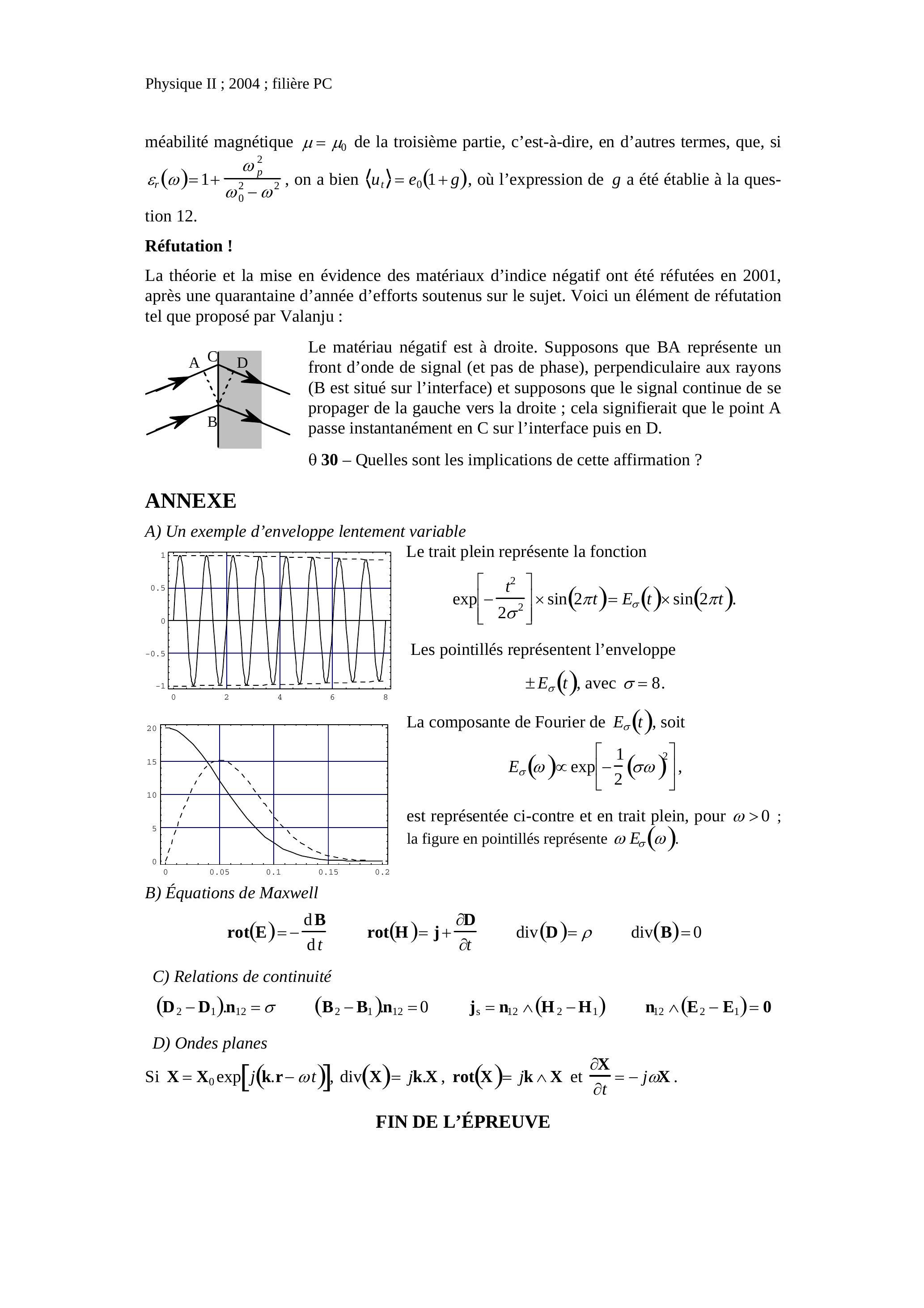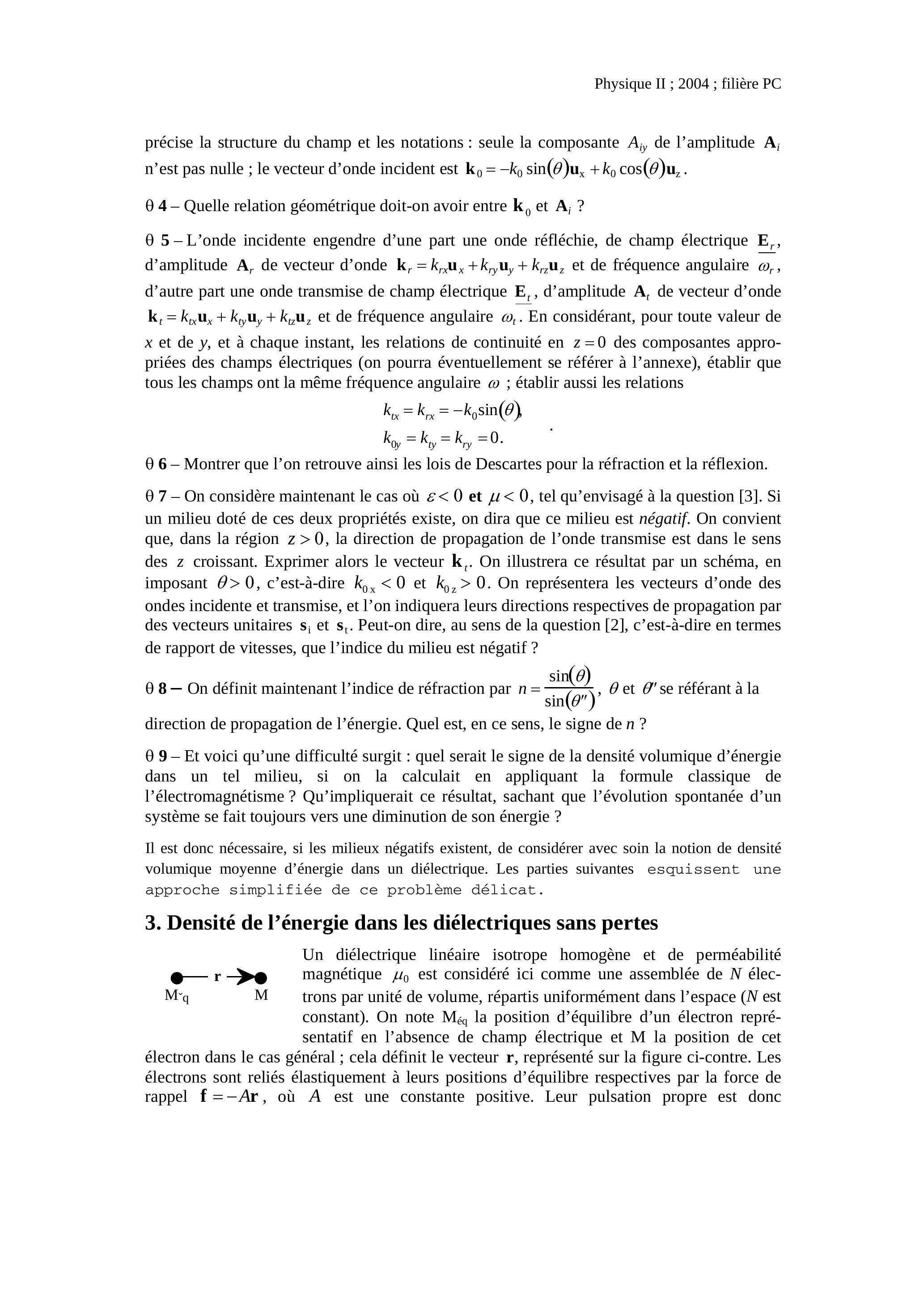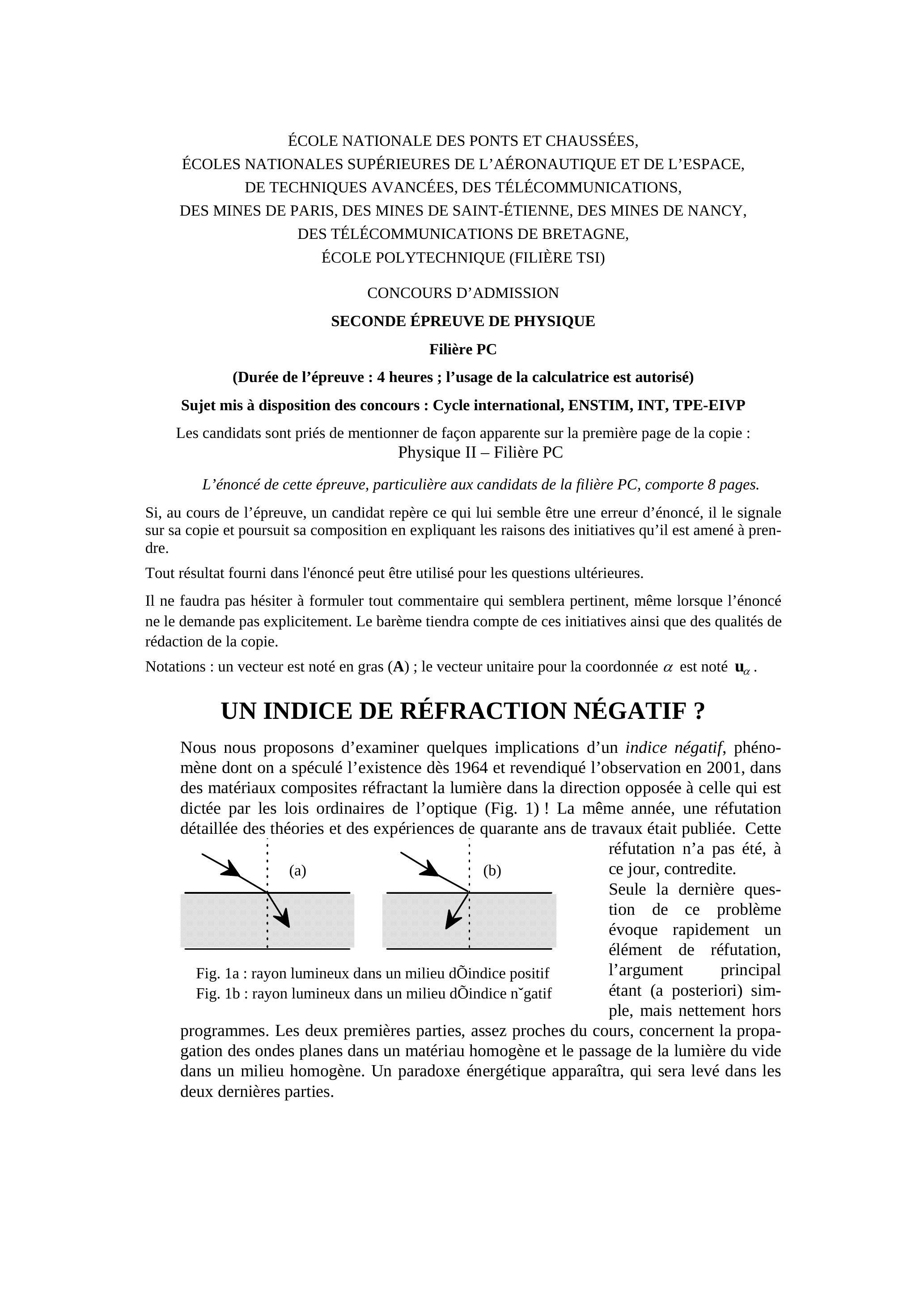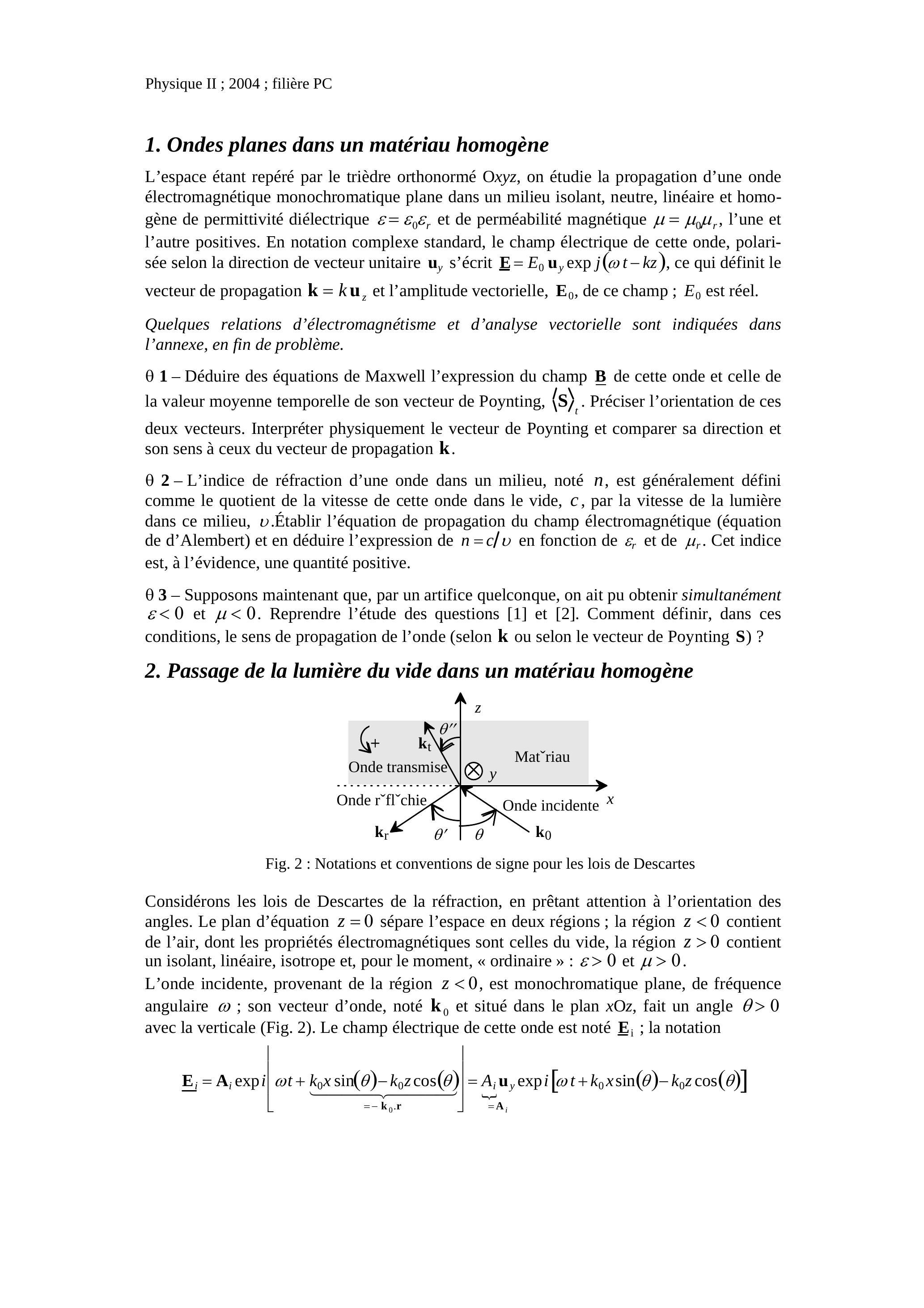 réfutation n'a pas été, à ce jour, contredite. Seule la dernière question de ce problème évoque rapidement un élément de réfutation, l'argument principal étant (a posteriori) simple, mais nettement hors programmes. Les deux premières parties, assez proches du cours, concernent la propagation des ondes planes dans un matériau homogène et le passage de la lumière du vide dans un milieu homogène. Un paradoxe énergétique apparaîtra, qui sera levé dans les deux dernières parties.
