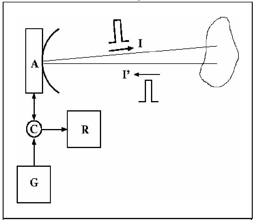 On supposera que le champ électromagnétique, monochromatique, est identique (en amplitude et en phase) en tout point de cette ouverture. regroupent en éléments d'électronique ( G générateur très haute fréquence, R récepteur à gain élevé, C commutateur), et d'une antenne A .