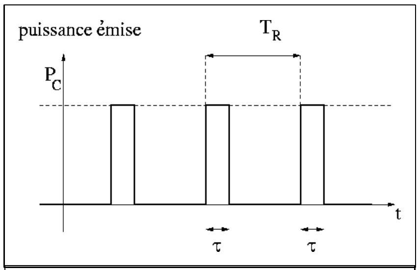 ) : il est alors d'usage de parler d'impulsion (impulsion signal). Cette impulsion arrive à l'antenne qui va transformer ce signal électrique en onde électromagnétique se propageant dans le milieu ambiant. Cette onde est donc monochromatique de durée brève et, là aussi, il est d'usage de parler d'impulsion (impulsion onde). On désignera par I l'impulsion émise.