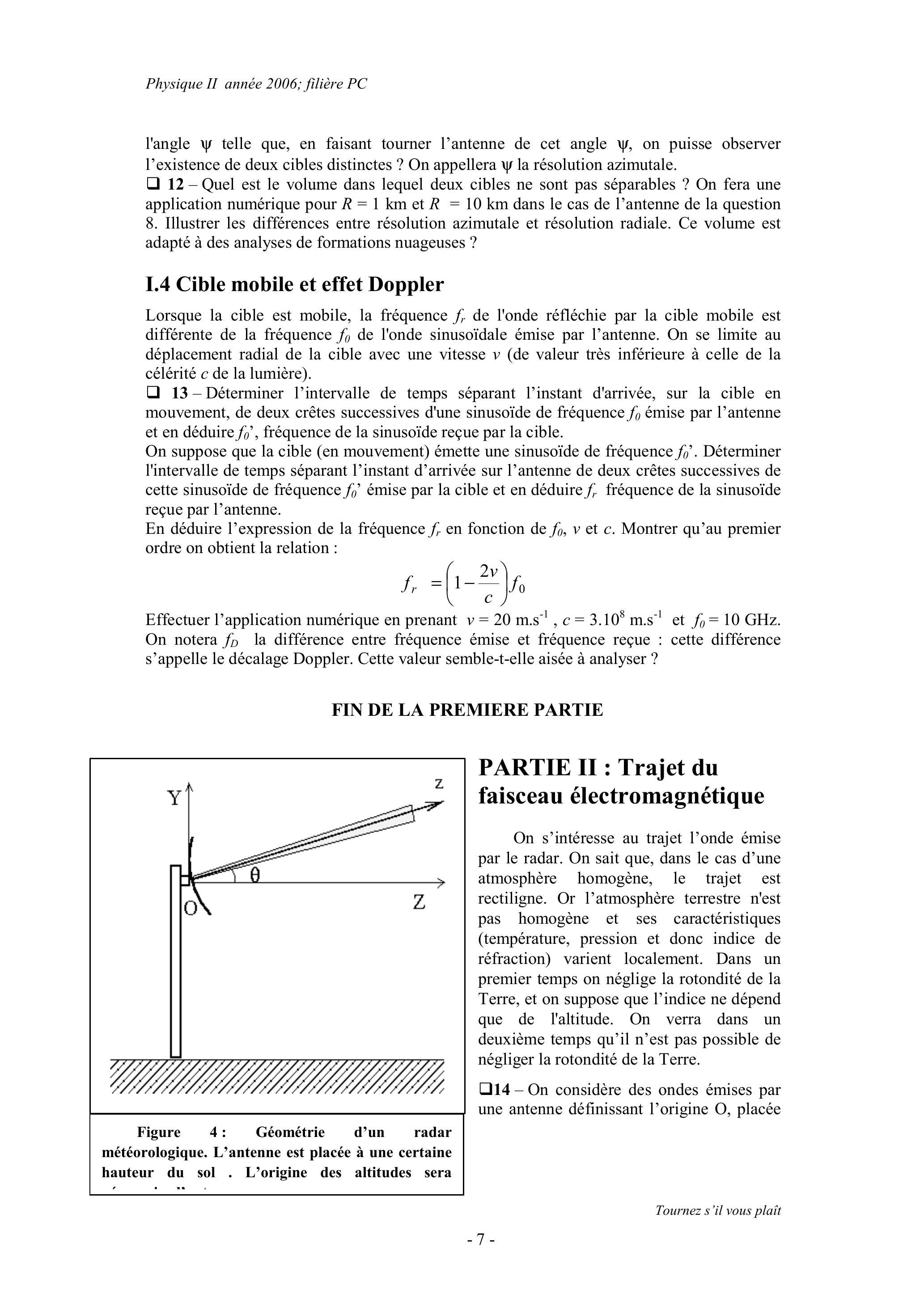 Pour étudier les formations nuageuses, diverses applications de radarmétéorologie peuvent être utilisées selon le type de «météores» rencontrés : brouillard, nuage de pluie, nuage de glace, ... Dans ce problème, seule sera étudiée l'application du radar à l'étude de nuages composés de gouttes d'eau que l'on supposera sphériques et de même rayon. On supposera que la fréquence de ce Radar est
