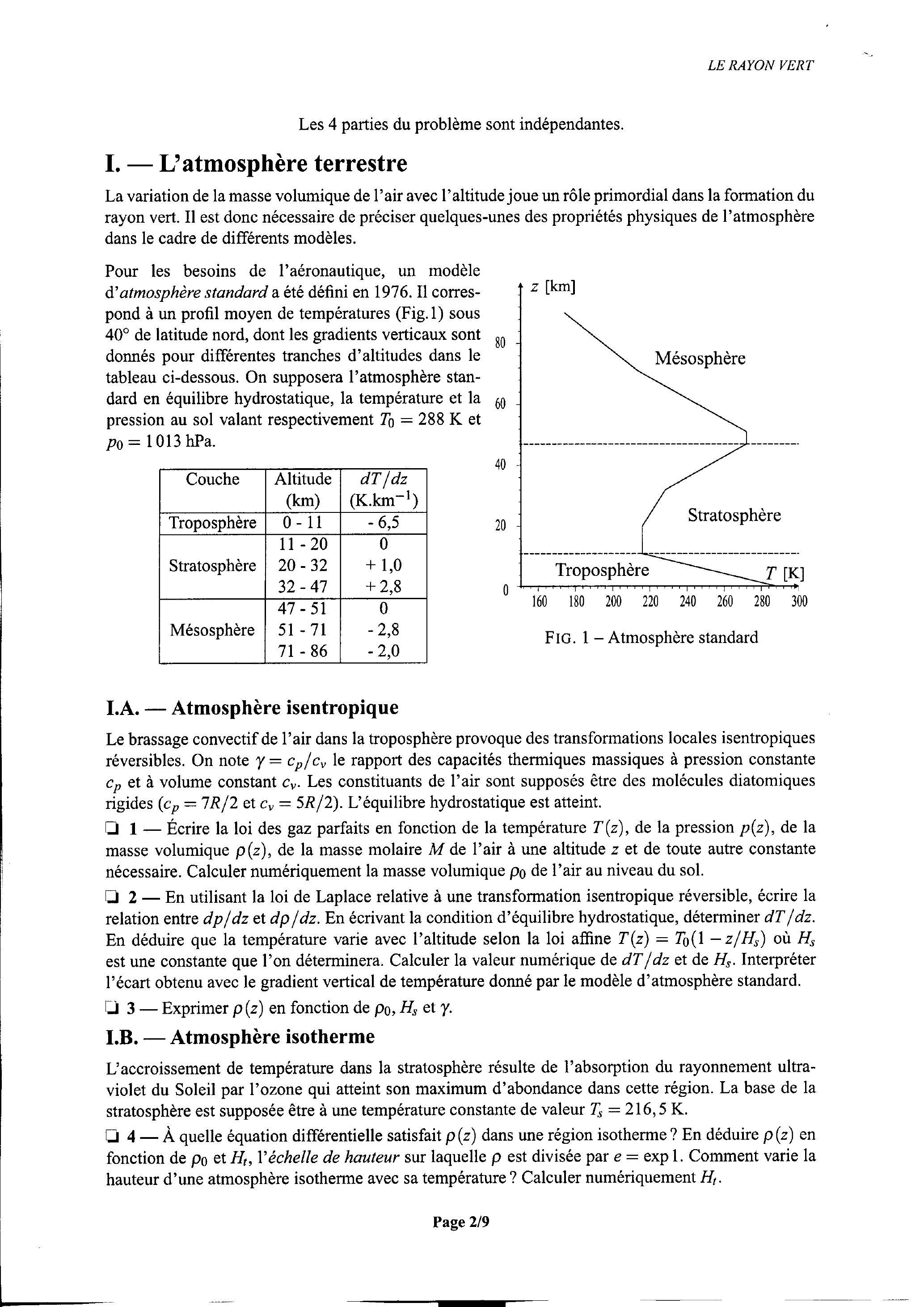 Pour les besoins de l'aéronautique, un modèle d'atmosphère standard a été défini en 1976. Il correspond à un profil moyen de températures (Fig.1) sous de latitude nord, dont les gradients verticaux sont donnés pour différentes tranches d'altitudes dans le tableau ci-dessous. On supposera l'atmosphère standard en équilibre hydrostatique, la température et la pression au sol valant respectivement et .